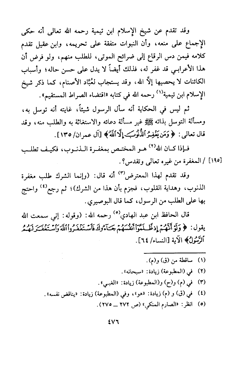 ثم ليس في الحكاية أنه سأل الرسول شيئًا، غايته أنه توسل به، ومسألة التوسل بذاته صلى الله عليه وسلم غير مسألة دعائه والاستغاثة به والطلب منه، وقد قال تعالى: {وَمَنْ يَغْفِرُ الذُّنُوبَ إِلَّا اللَّهُ} [آل عمران: 135] [آل عمران / 135] . فإذا كان الله (¬2) هو المختص بمغفرة الذنوب، فكيف تطلب المغفرة من غيره تعالى وتقدس؟ .