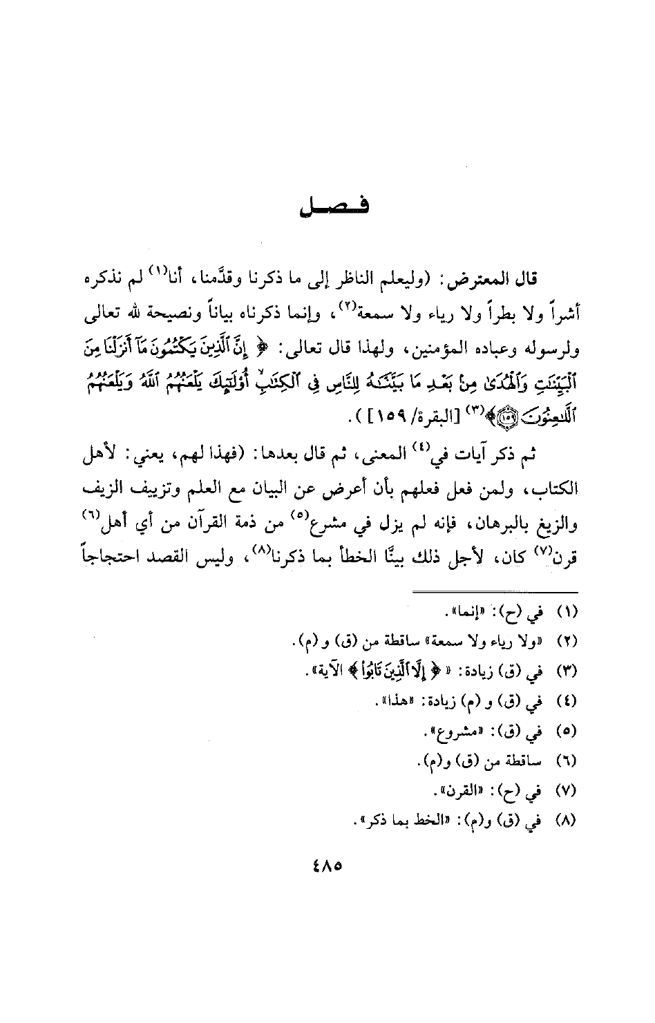 فصل قال المعترض: (وليعلم الناظر إلى ما ذكرنا وقدَّمنا، أنا) (¬1) لم نذكره أشرًا ولا بطرًا ولا رياء ولا سمعة (¬2) وإنما ذكرناه بيانًا ونصيحة لله تعالى ولرسوله وعباده المؤمنين، ولهذا قال تعالى: {إِنَّ الَّذِينَ يَكْتُمُونَ مَا أَنْزَلْنَا مِنَ الْبَيِّنَاتِ وَالْهُدَى مِنْ بَعْدِ مَا بَيَّنَّاهُ لِلنَّاسِ فِي الْكِتَابِ أُولَئِكَ يَلْعَنُهُمُ اللَّهُ وَيَلْعَنُهُمُ اللَّاعِنُونَ} [البقرة: 159] (¬3) [البقرة / 159] ) .