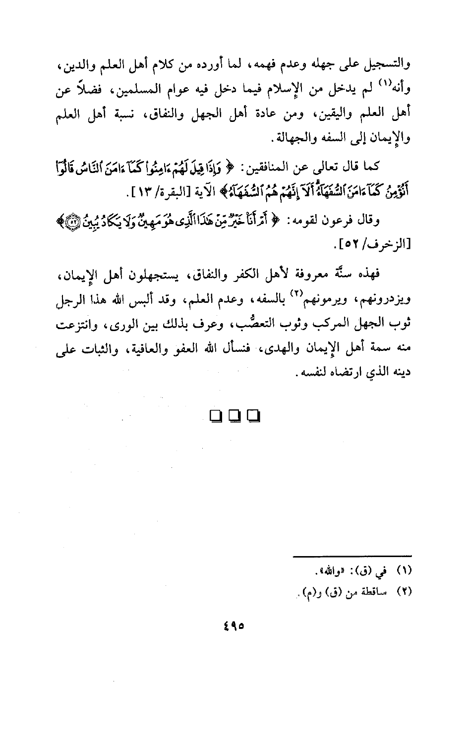والتسجيل على جهله وعدم فهمه، لما أورده من كلام أهل العلم والدين، وأنه (¬1) لم يدخل من الْإِسلام فيما دخل فيه عوام المسلمين، فضلًا عن أهل العلم واليقين، ومن عادة أهل الجهل والنفاق، نسبة أهل العلم والْإِيمان إلى السفه والجهالة.
