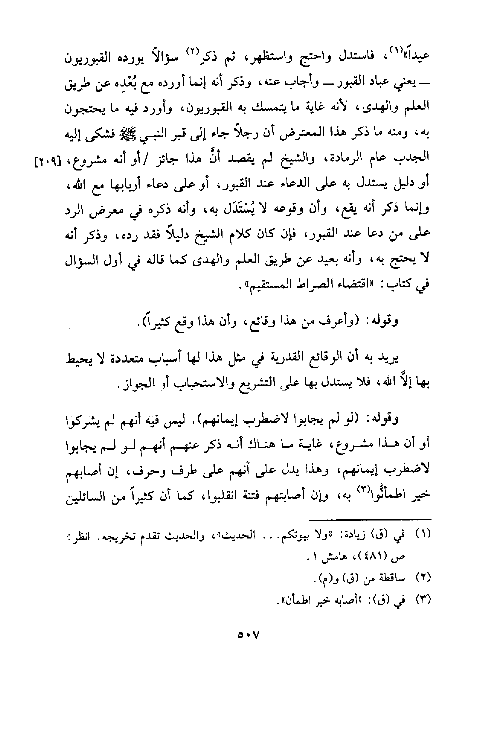 عيدًا» " (¬1) فاستدل واحتج واستظهر، ثم ذكر (¬2) سؤالًا يورده القبوريون- يعني عباد القبور- وأجاب عنه، وذكر أنه إنما أورده مع بُعْدِه عن طريق العلم والهدى، لأنه غاية ما يتمسك به القبوريون، وأورد فيه ما يحتجون به، ومنه ما ذكر هذا المعترض أن رجلًا جاء إلى قبر النبي صلى الله عليه وسلم فشكى إليه الجدب عام الرمادة، والشيخ لم يقصد أنَّ هذا جائز أو أنه مشروع، أو دليل يستدل به على الدعاء عند القبور، أو على دعاء أربابها مع الله، وإنما ذكر أنه يقع، وأن وقوعه لا يُسْتَدَل به، وأنه ذكره في معرض الرد على من دعا عند القبور، فإن كان كلام الشيخ دليلًا فقد رده، وذكر أنه لا يحتج به، وأنه بعيد عن طريق العلم والهدى كما قاله في أول السؤال في كتاب: "اقتضاء الصراط المستقيم ".