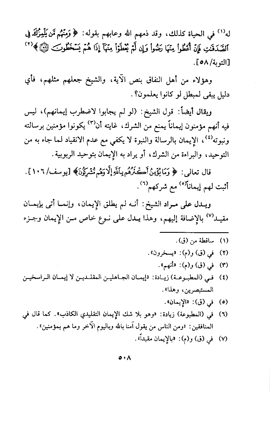 قال تعالى: {وَمَا يُؤْمِنُ أَكْثَرُهُمْ بِاللَّهِ إِلَّا وَهُمْ مُشْرِكُونَ} [يوسف: 106] [يوسف / 106] . أثبت لهم إيمانًا (¬5) مع شركهم (¬6) . ويدل على مراد الشيخ: أنه لم يطلق الإيمان، وإنما أتى بإيمان مقيد (¬7) بالإضافة إليهم، وهذا يدل على نوع خاص من الإيمان وجزء