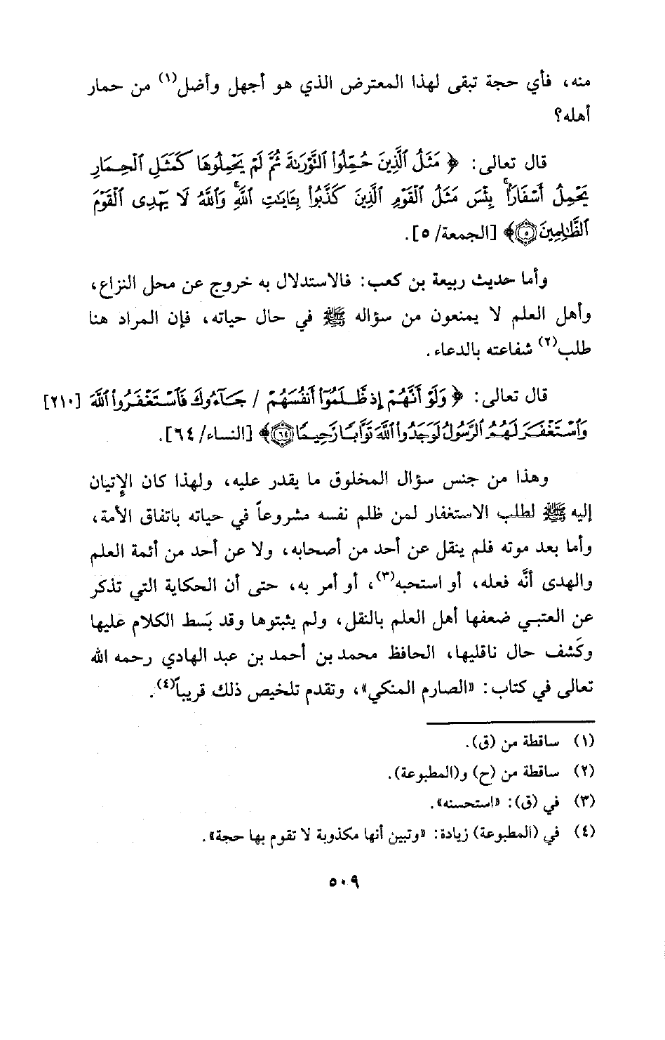 وهذا من جنس سؤال المخلوق ما يقدر عليه، ولهذا كان الإتيان إليه صلى الله عليه وسلم لطلب الاستغفار لمن ظلم نفسه مشروعًا في حياته باتفاق الأمة، وأما بعد موته فلم ينقل عن أحد من أصحابه، ولا عن أحد من أئمة العلم والهدى أنَّه فعله، أو استحبه (¬3) أو أمر به، حتى أن الحكاية التي تذكر عن العتبي ضعفها أهل العلم بالنقل، ولم يثبتوها وقد بَسط الكلام عليها وكَشف حال ناقليها، الحافظ محمد بن أحمد بن عبد الهادي رحمه الله تعالى في كتاب: "الصارم المنكي"، وتقدم تلخيص ذلك قريبًا (¬4) .