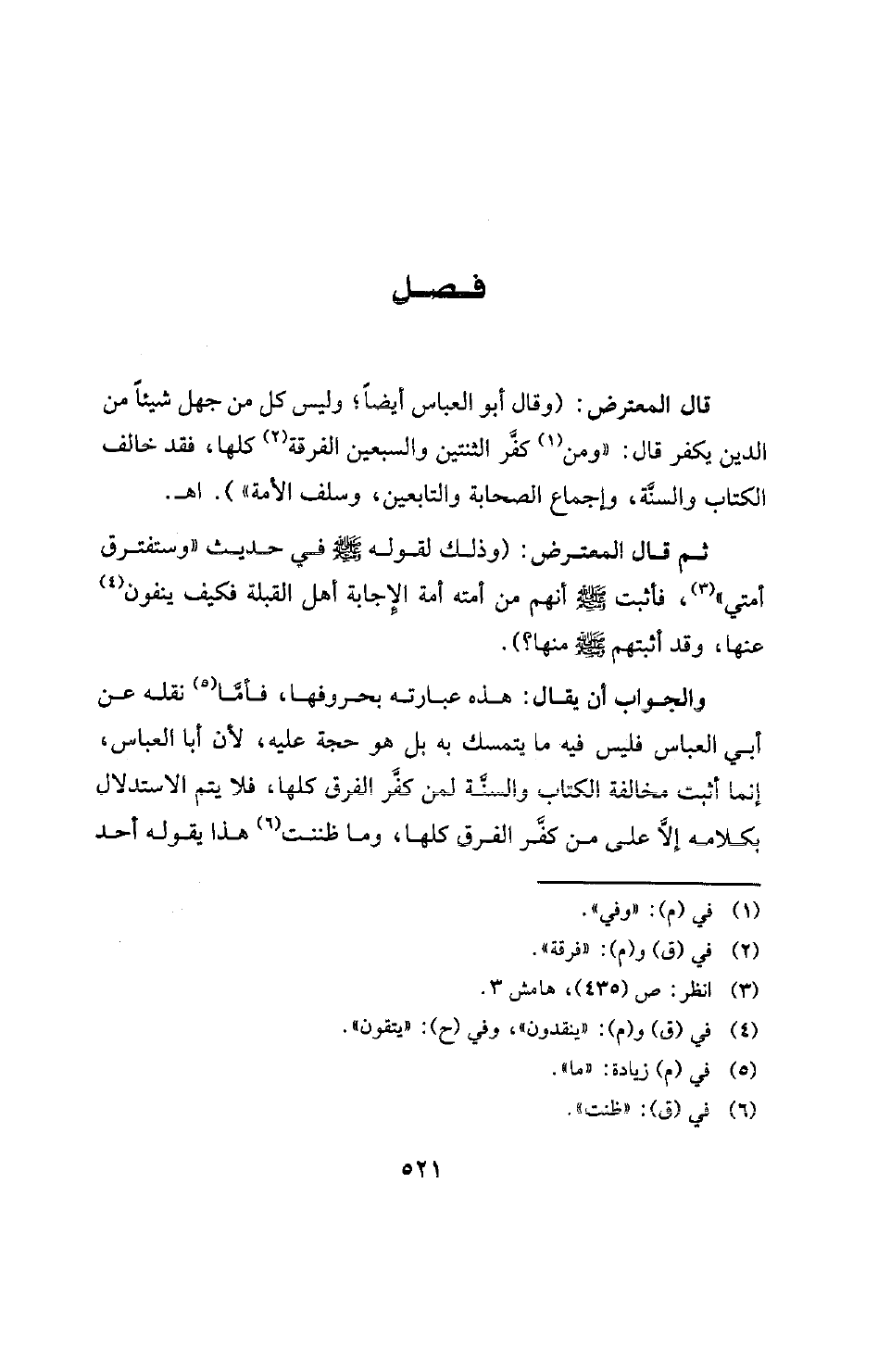 والجواب أن يقال: هذه عبارته بحروفها، فأما (¬5) نقله عن أبي العباس فليس فيه ما يتمسك به بل هو حجة عليه، لأن أبا العباس، إنما أثبت مخالفة الكتاب والسنَّة لمن كفَّر الفرق كلها، فلا يتم الاستدلال بكلامه إلاَّ على من كفَّر الفرق كلها، وما ظننت (¬6) هذا يقوله أحد