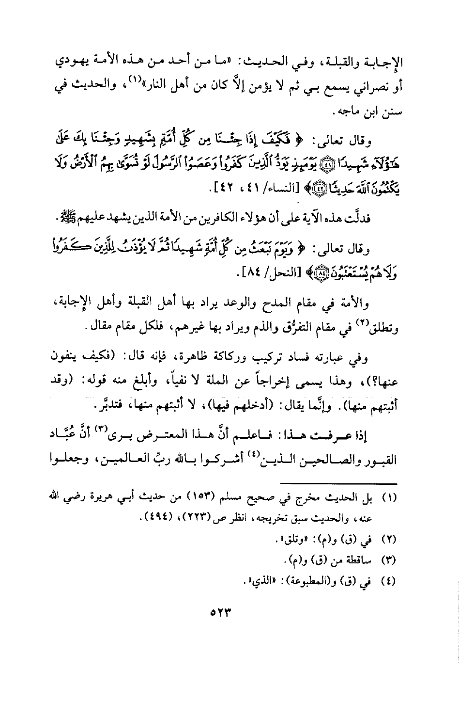الْإِجابة والقبلة، وفي الحديث: " «ما من أحد من هذه الأمة يهودي أو نصراني يسمع بي ثم لا يؤمن إلاَّ كان من أهل النار» " (¬1) والحديث في سنن ابن ماجه.