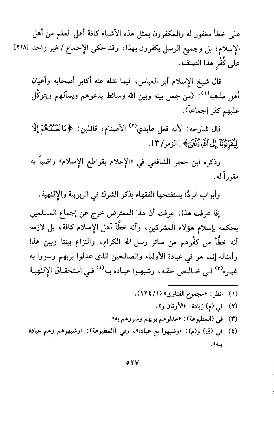 على خطأ مغفور له والمكفرون بمثل هذه الأشياء كافة أهل العلم من أهل الْإِسلام؛ بل وجميع الرسل يكفرون بهذا، وقد حكى الْإِجماع غير واحد [218] على كُفْرِ هذا الصنف.