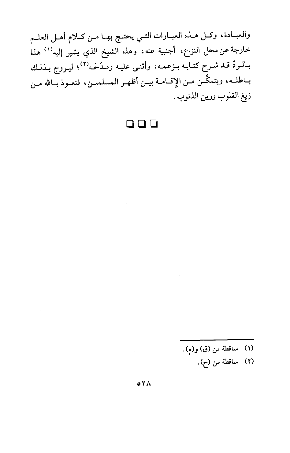 والعبادة، وكل هذه العبارات التي يحتج بها من كلام أهل العلم خارجة عن محل النزاع، أجنبية عنه، وهذا الشيخ الذي يشير إليه (¬1) هذا بالردّ قد شرح كتابه بزعمه، وأثنى عليه ومدَحَه (¬2) ؛ ليروج بذلك باطله، ويتمكَّن من الْإِقامة بين أظهر المسلمين، فنعوذ بالله من زيغ القلوب ورين الذنوب.