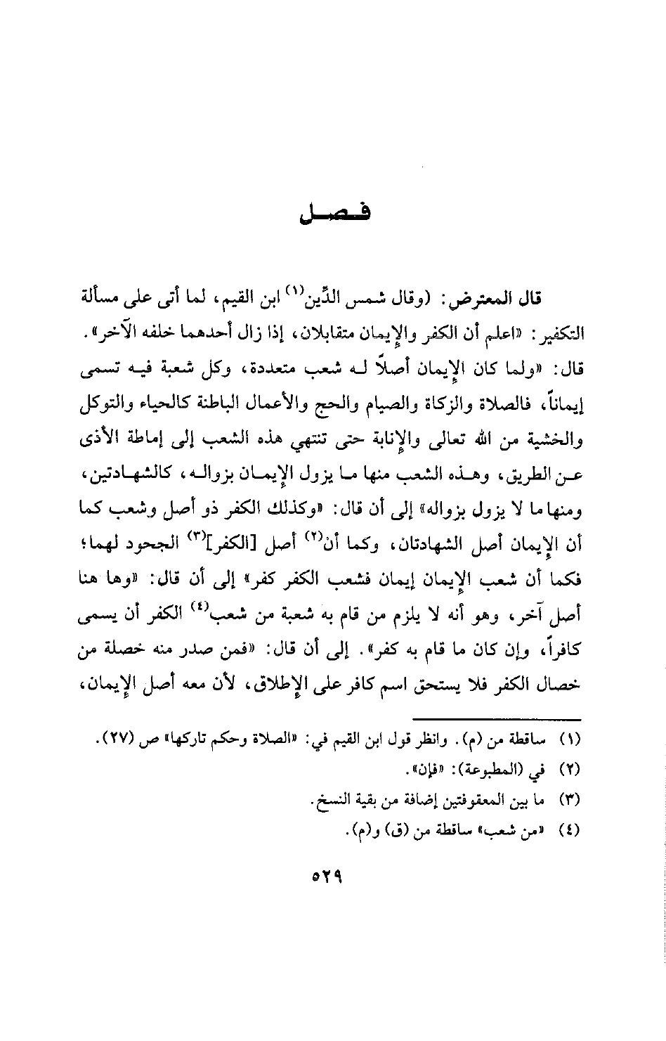 فصل قال المعترض: (وقال شمس الدِّين (¬1) ابن القيم، لما أتى على مسألة التكفير: "اعلم أن الكفر والْإِيمان متقابلان، إذا زال أحدهما خلفه الآخر".