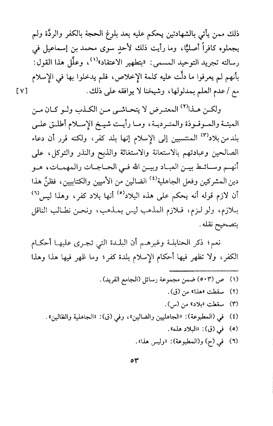 ولكن هذا (¬2) المعترض لا يتحاشى من الكذب ولو كان من الميتة والموقوذة والمتردية، وما رأيت شيخ الإسلام أطلق على بلد من بلاد (¬3) المنتسبين إلى الإسلام إنها بلد كفر، ولكنه قرر أن دعاء الصالحين وعبادتهم بالاستعانة والاستغاثة والذبح والنذر والتوكل، على أنهم وسائط بين العباد وبين الله في الحاجات والمهمات، هو دين المشركين وفعل الجاهلية (¬4) الضالين من الأميين والكتابيين، فظنَّ هذا أن لازم قوله أنه يحكم على هذه البلاد (¬5) أنها بلاد كفر، وهذا ليس (¬6) بلازم، ولو لزم، فلازم المذهب ليس بمذهب، ونحن نطالب الناقل بتصحيح نقله.