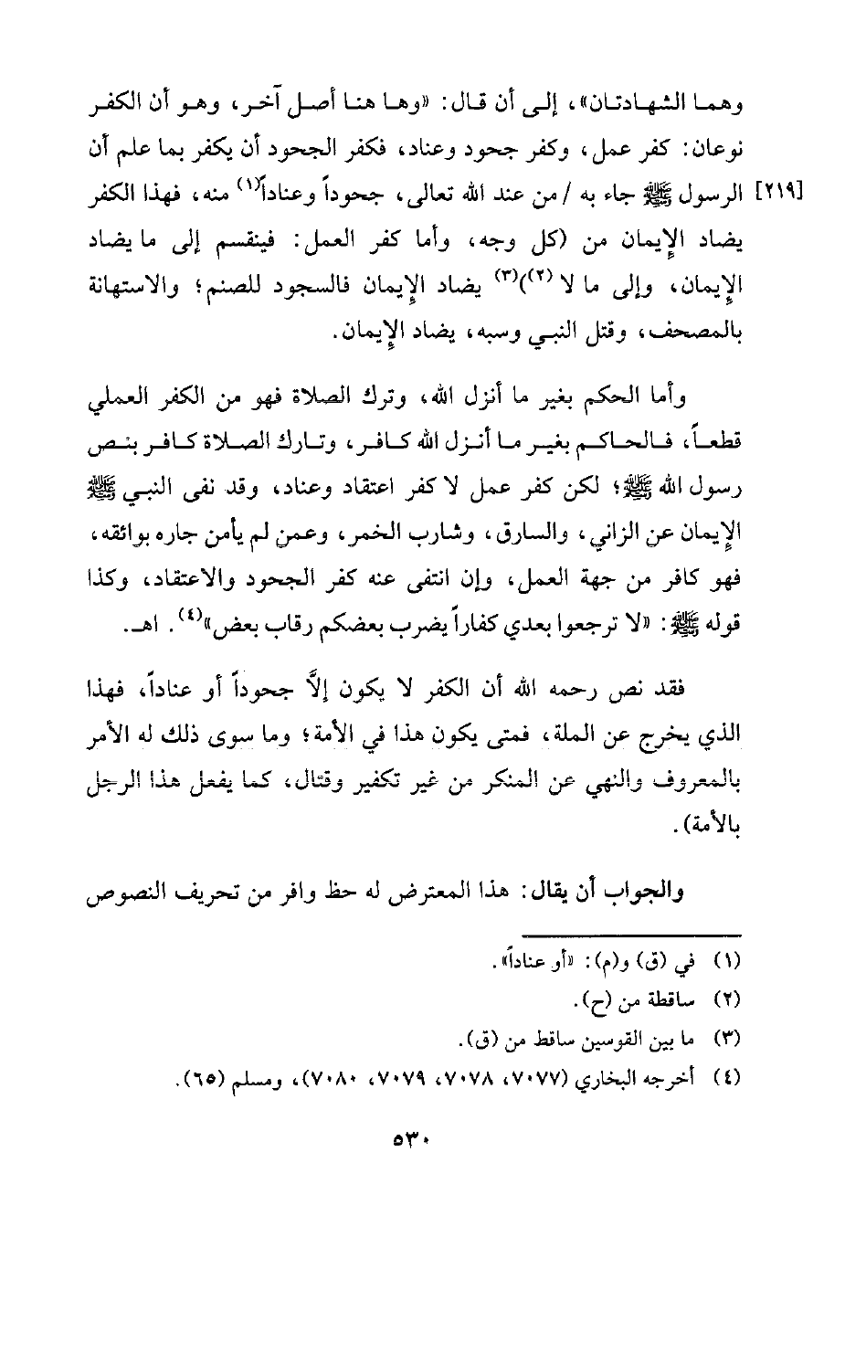 فقد نص رحمه الله أن الكفر لا يكون إلاَّ جحودًا أو عنادًا، فهذا الذي يخرج عن الملة، فمتى يكون هذا في الأمة؟ وما سوى ذلك له الأمر بالمعروف والنهي عن المنكر من غير تكفير وقتال، كما يفعل هذا الرجل بالأمة) .