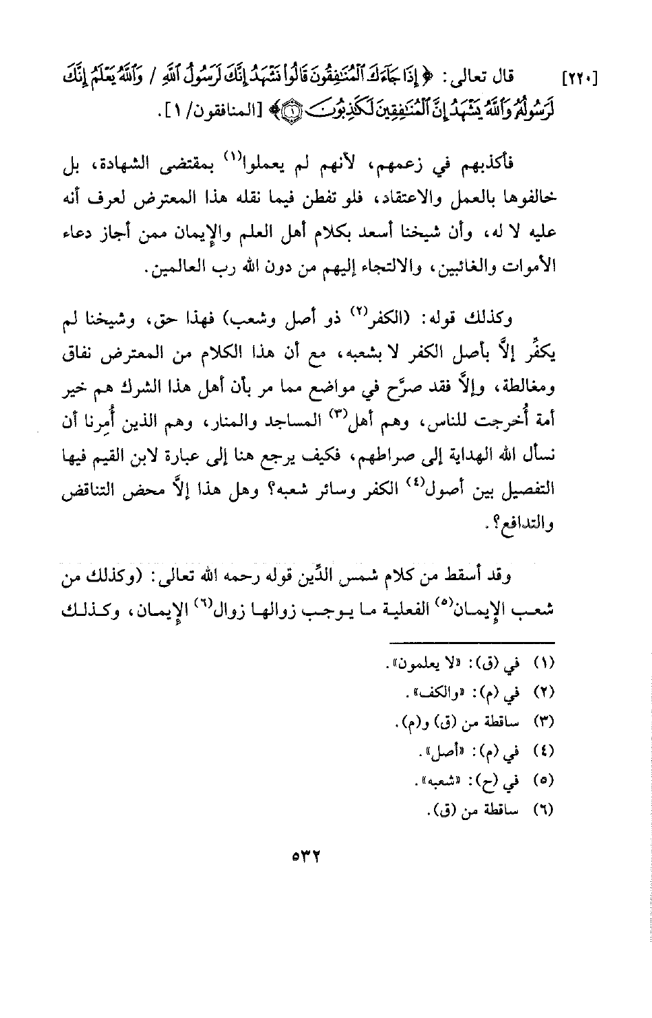وكذلك قوله: (الكفر (¬2) ذو أصل وشعب) فهذا حق، وشيخنا لم يكفِّر إلاَّ بأصل الكفر لا بشعبه، مع أن هذا الكلام من المعترض نفاق ومغالطة، وإلا فقد صرَّح في مواضع مما مر بأن أهل هذا الشرك هم خير أمة أُخرجت للناس، وهم أهل (¬3) المساجد والمنار، وهم الذين أُمِرنا أن نسأل الله الهداية إلى صراطهم، فكيف يرجع هنا إلى عبارة لابن القيم فيها التفصيل بين أصول (¬4) الكفر وسائر شعبه؟ وهل هذا إلاَّ محض التناقض والتدافع؟ .