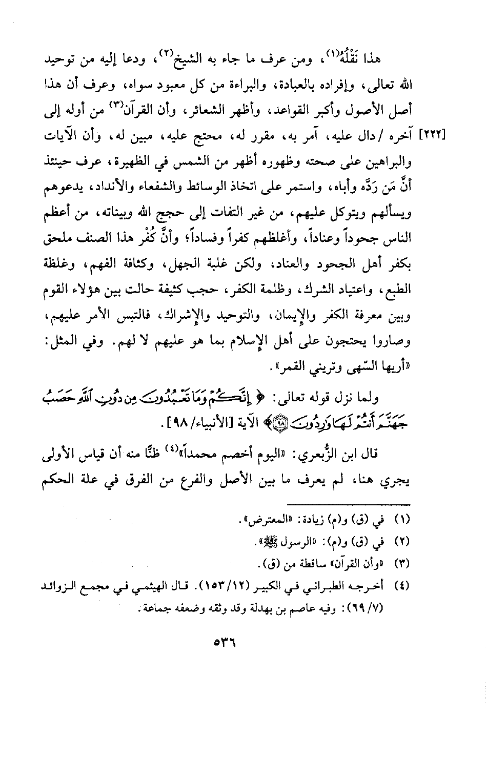 هذا نَقْلُهُ (¬1) ومن عرف ما جاء به الشيخ (¬2) ودعا إليه من توحيد الله تعالى، وإفراده بالعبادة، والبراءة من كل معبود سواه، وعرف أن هذا أصل الأصول وأكبر القواعد، وأظهر الشعائر، وأن القران "وأن القرآن" (¬3) من أوله إلى [222] آخره دال عليه، آمر به، مقرر له، محتج عليه، مبين له، وأن الآيات والبراهين على صحته وظهوره أظهر من الشمس في الظهيرة، عرف حينئذ أنَّ مَن رَدَّه وأباه، واستمر على اتخاذ الوسائط والشفعاء والأنداد، يدعوهم ويسألهم ويتوكل عليهم، من غير التفات إلى حجج الله وبيناته، من أعظم الناس جحودًا وعنادًا، وأغلظهم كفرًا وفسادًا؟ وأنَّ كُفْر هذا الصنف ملحق بكفر أهل الجحود والعناد، ولكن غلبة الجهل، وكثافة الفهم، وغلظة الطبع، واعتياد الشرك، وظلمة الكفر، حجب كثيفة حالت بين هؤلاء القوم وبين معرفة الكفر والإيمان، والتوحيد والإشراك، فالتبس الأمر عليهم، وصاروا يحتجون على أهل الإسلام بما هو عليهم لا لهم. وفي المثل: "أريها السّهى وتريني القمر".