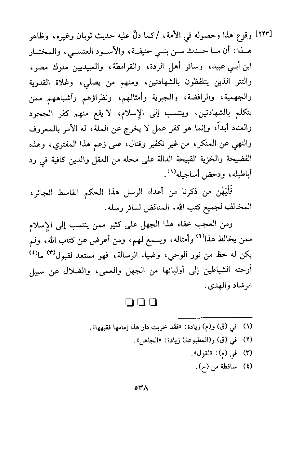 [223] ، وقوع هذا وحصوله في الأمة، كما دلَّ عليه حديث ثوبان وغيره، وظاهر هذا: أن ما حدث من بني حنيفة، والأسود العنسي، والمختار ابن أبي عبيد، وسائر أهل الردة، والقرامطة، والعبيديين ملوك مصر، والتتر الذين يتلفظون بالشهادتين، ومنهم من يصلي، وغلاة القدرية والجهمية، والرافضة، والجبرية وأمثالهم، ونظراؤهم وأشباههم ممن يتكلم بالشهادتين، وينتسب إلى الإسلام، لا يقع منهم كفر الجحود والعناد أبدًا، وإنما هو كفر عمل لا يخرج عن الملة، له الأمر بالمعروف والنهي عن المنكر، من غير تكفير وقتال، على زعم هذا المفتري، وهذه الفضيحة والخزية القبيحة الدالة على محله من العقل والدين كافية في رد أباطيله، ودحض أساجيله (¬1) فَلْيَهْن من ذكرنا من أعداء الرسل هذا الحكم القاسط الجائر، المخالف لجميع كتب الله، المناقض لسائر رسله.