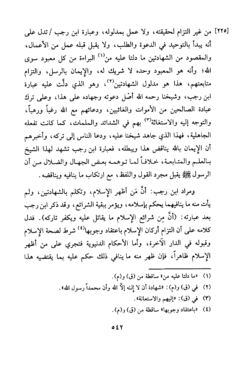 ، من غير التزام لحقيقته، ولا عمل بمدلوله، وعبارة ابن رجب تدل على أنه يبدأ بالتوحيد في الدعوة والطلب، ولا يقبل قبله عمل من الأعمال، والمقصود من الشهادتين ما دلتا عليه من (¬1) البراءة من كل معبود سوى الله؛ وأنه هو المعبود وحده لا شريك له، والإيمان بالرسل، والتزام متابعتهم، هذا هو مدلول الشهادتين (¬2) وهو الذي دلَّت عليه عبارة ابن رجب، وشيخنا رحمه الله أصْل دعوته وجهاده على هذا، وعلى ترك عبادة الصالحين من الأموات والغائبين، ودعائهم مع الله رغبًا ورهبًا، والتوجه إليه والاستغاثة (¬3) بهم في الشدائد والملمات، كما كانت تفعله الجاهلية، فهذا الذي جاهد شيخنا عليه، ودعا الناس إلى تركه، وأخبرهم أن الإيمان بالله يناقض هذا ويبطله، فعبارة ابن رجب تشهد لهذا الشيخ بالعلم والمتابعة، خلافًا لما توهمه بعض الجهال والضلال من أن الرسول صلى الله عليه وسلم يقبل مجرد القول واللفظ، مع ارتكاب ما ينافيه ويناقضه.