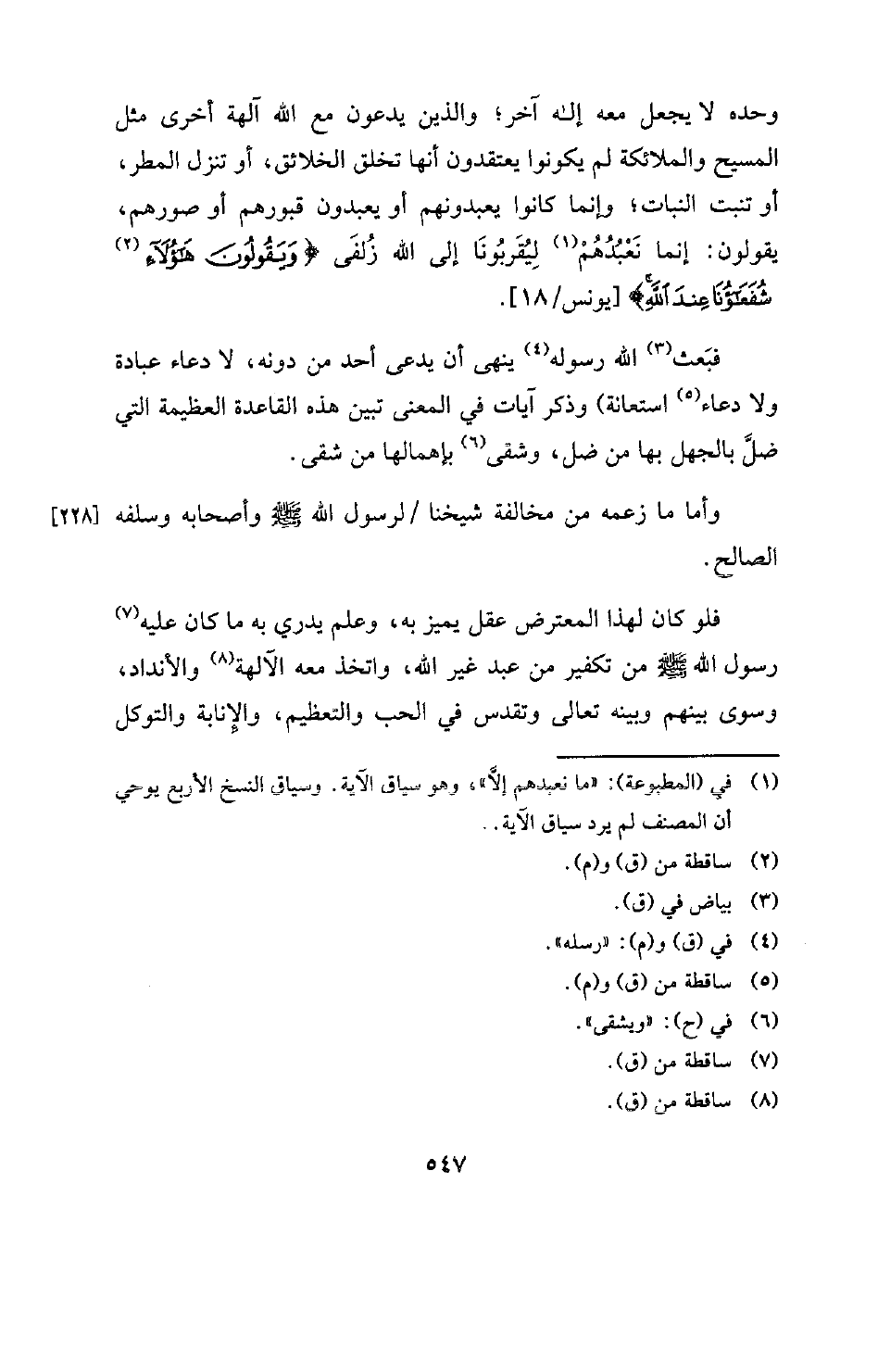فلو كان لهذا المعترض عقل يميز به، وعلم يدري به ما كان عليه (¬7) رسول الله صَلَّى اللَّهُ عَلَيْهِ وَسَلِّم من تكفير من عبد غير الله، واتخذ معه الآلهة (¬8) والأنداد، وسوى بينهم وبينه تعالى وتقدس في الحب والتعظيم، والْإِنابة والتوكل