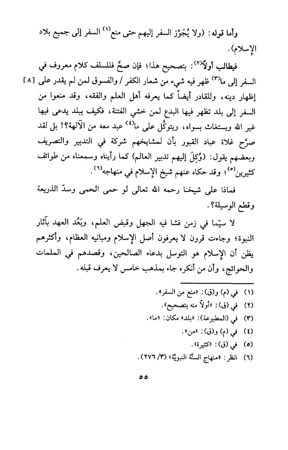 فيطالب أولا (¬2) بتصحيح هذا؛ فإن صحَّ فللسلف كلام معروف في السفر إلى ما (¬3) ظهر فيه شيء من شعار الكفر والفسوق لمن لم يقدر على [8] إظهار دينه، وللقادر أيضًا كما يعرفه أهل العلم والفقه، وقد منعوا من السفر إلى بلد تظهر فيها البدع لمن خشي الفتنة، فكيف ببلد يدعى فيها غير الله ويستغاث بسواه، ويتوكَّل على ما (¬4) عبد معه من الإلهة؛ بل لقد صرَّح غلاة عباد القبور بأن لمشايخهم شركة في التدبير والتصريف وبعضهم يقول: (وُكِلَ إليهم تدبير العالم) كما رأيناه وسمعناه من طوائف كثيرين (¬5) ؛ وقد حكاه عنهم شيخ الإسلام في مِنْهَاجِهِ (¬6) .