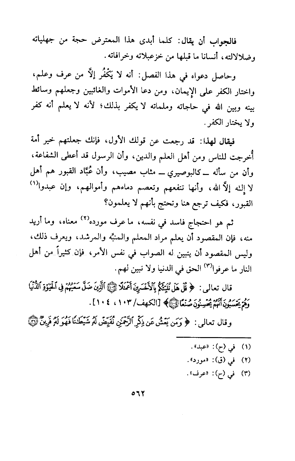 وحاصل دعواه في هذا الفصل: أنه لا يَكْفُر إلاَّ من عرف وعلم، واختار الكفر على الإيمان، ومن دعا الأموات والغائبين وجعلهم وسائط بينه وبين الله في حاجاته وملماته لا يكفر بذلك؛ لأنه لا يعلم أنه كفر ولا يختار الكفر.
