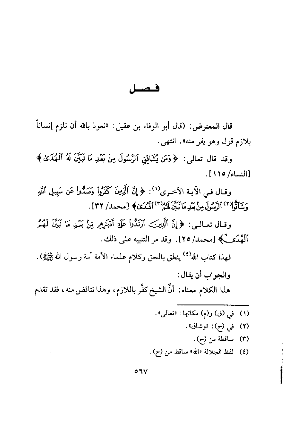 فصل قال المعترض: (قال أبو الوفاء بن عقيل: "نعوذ بالله أن نلزم إنسانًا بلازم قول وهو يفر منه". انتهى.