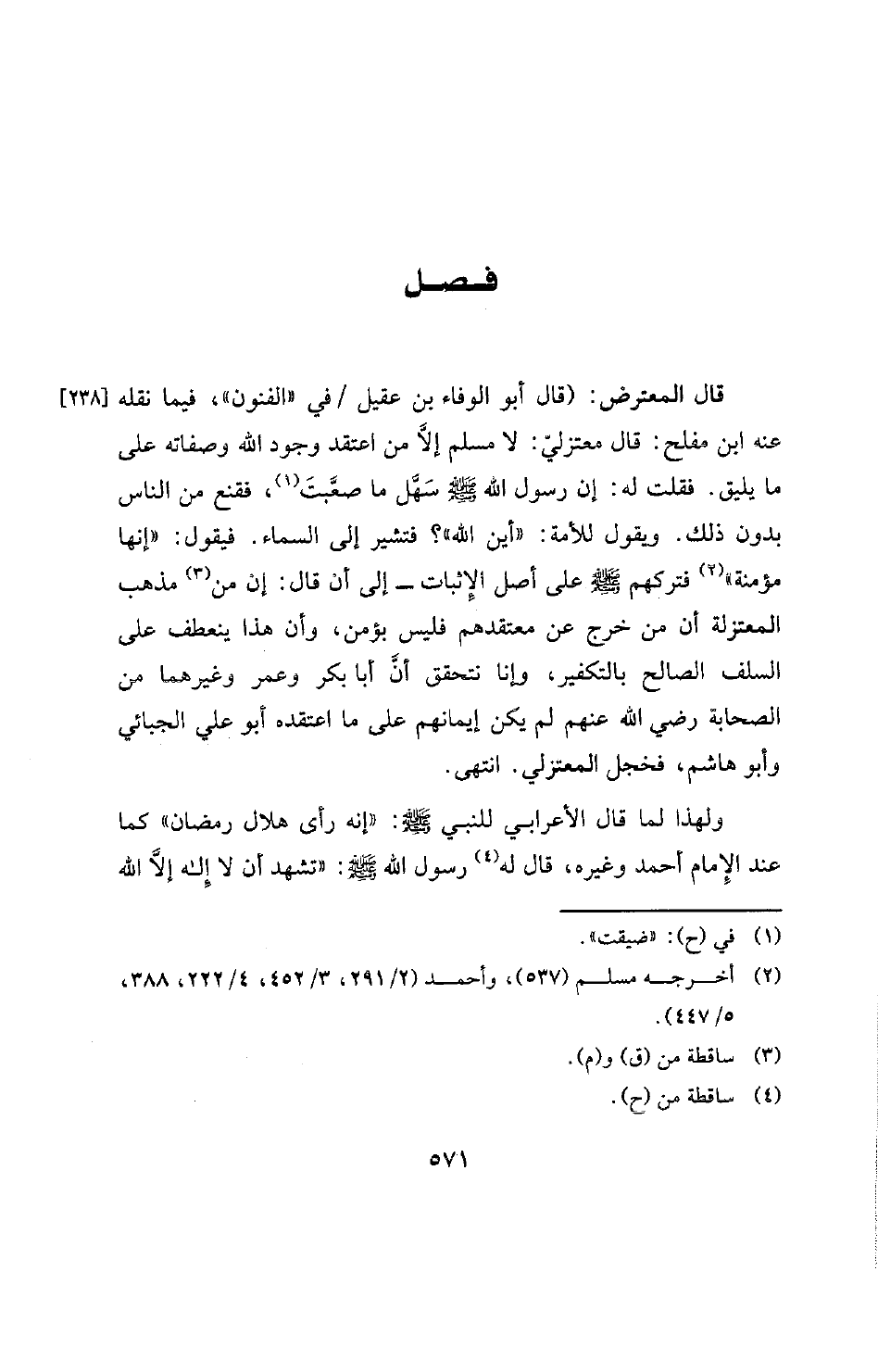فصل قال المعترض: (قال أبو الوفاء بن عقيل في "الفنون "، فيما نقله عنه ابن مفلح: تال معتزليّ: لا مسلم إلا من اعتقد وجود الله وصفاته على ما يليق. فقلت له: إن رسول الله صلى الله عليه وسلم سَهَّل ما صعَّبتَ (¬1) فقنع من الناس بدون ذلك. «ويقول للأَمَة: "أين الله "؟ فتشير إلى السماء. فيقول: "إنها مؤمنة» " (¬2) فتركهم صلى الله عليه وسلم على أصل الإثبات- إلى أن قال: إن من (¬3) مذهب المعتزلة أن من خرج عن معتقدهم فليس بؤمن، وأن هذا ينعطف على السلف الصالح بالتكفير، وإنا نتحقق أنَّ أبا بكر وعمر وغيرهما من الصحابة رضي الله عنهم لم يكن إيمانهم على ما اعتقده أبو علي الجبائي وأبو هاشم، فخجل المعتزلي. انتهى.