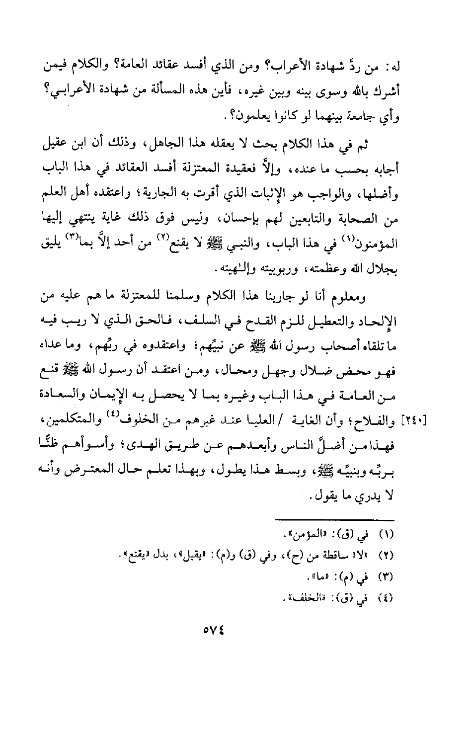 ومعلوم أنا لو جارينا هذا الكلام وسلمنا للمعتزلة ما هم عليه من الإلحاد والتعطيل للزم القدح في السلف، فالحق الذي لا ريب فيه ما تلقاه أصحاب رسول الله صلى الله عليه وسلم عن نبيِّهم؛ واعتقدوه في ربِّهم، وما عداه فهو محض ضلال وجهل ومحال، ومن اعتقد أن رسول الله صلى الله عليه وسلم قنع من العامة في هذا الباب وغيره بما لا يحصل به الإيمان والسعادة والفلاح؛ وأن الغاية العليا عند غيرهم من الخلوف (¬4) والمتكلمين، فهذا من أضلَّ الناس وأبعدهم عن طريق الهدى، وأسوأهم ظنًّا بربِّه وبنبيِّه صلى الله عليه وسلم، وبسط هذا يطول، وبهذا تعلم حال المعترض وأنه لا يدري ما يقول.
