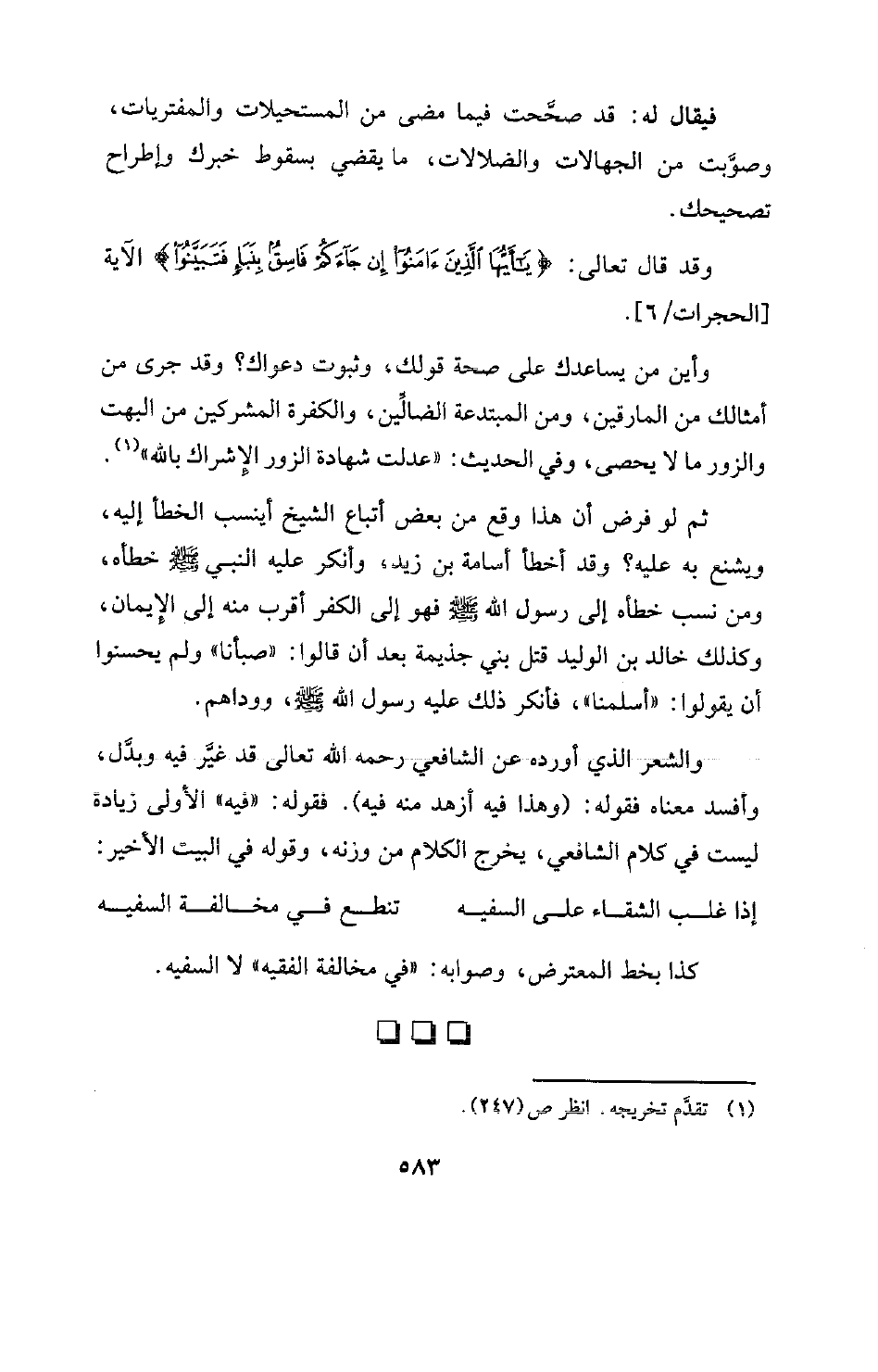 فيقال له: قد صحَّحت فيما مضى من المستحيلات والمفتريات، وصوَّبت من الجهالات والضلالات، ما يقضي بسقوط خبرك واطراح تصحيحك. وقد قال تعالى: {يَا أَيُّهَا الَّذِينَ آمَنُوا إِنْ جَاءَكُمْ فَاسِقٌ بِنَبَإٍ فَتَبَيَّنُوا} [الحجرات: 6] الآية [الحجرات / 6] وأين من يساعدك على صحة قولك، وثبوت دعواك؟ وقد جرى من أمثالك من المارقين، ومن المبتدعة الضالين، والكفرة المشركين من البهت والزور ما لا يحصى، وفي الحديث: " «عدلت شهادة الزور الإشراك باللَّه» " (¬1) .