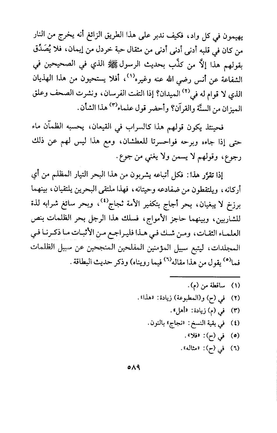 إذا تقرر هذا: فكل أتباعه يشربون من هذا البحر التيار المظلم من أي أركانه، ويلتقطون من ضفادعه وحيتانه، فهذا ملتقى البحرين يلتقيان، بينهما برزخ لا يبغيان، بحر أجاج بتكفير الأمة ثجاج (¬4) وبحر سائغ شرابه لذة للشاربين، وبينهما حاجز الأمواج، فسلك هذا الرجل بحر الظلمات بنص العلماء الثقات، ومن شك في هذا فليراجع من الأثبات ما ذكرنا في المجلدات، ليتبع سبيل المؤمنين المفلحين المنجحين عن سبيل الظلمات فما (¬5) يقول من هذا مقاله (¬6) فيما رويناه) وذكر حديث البطاقة.