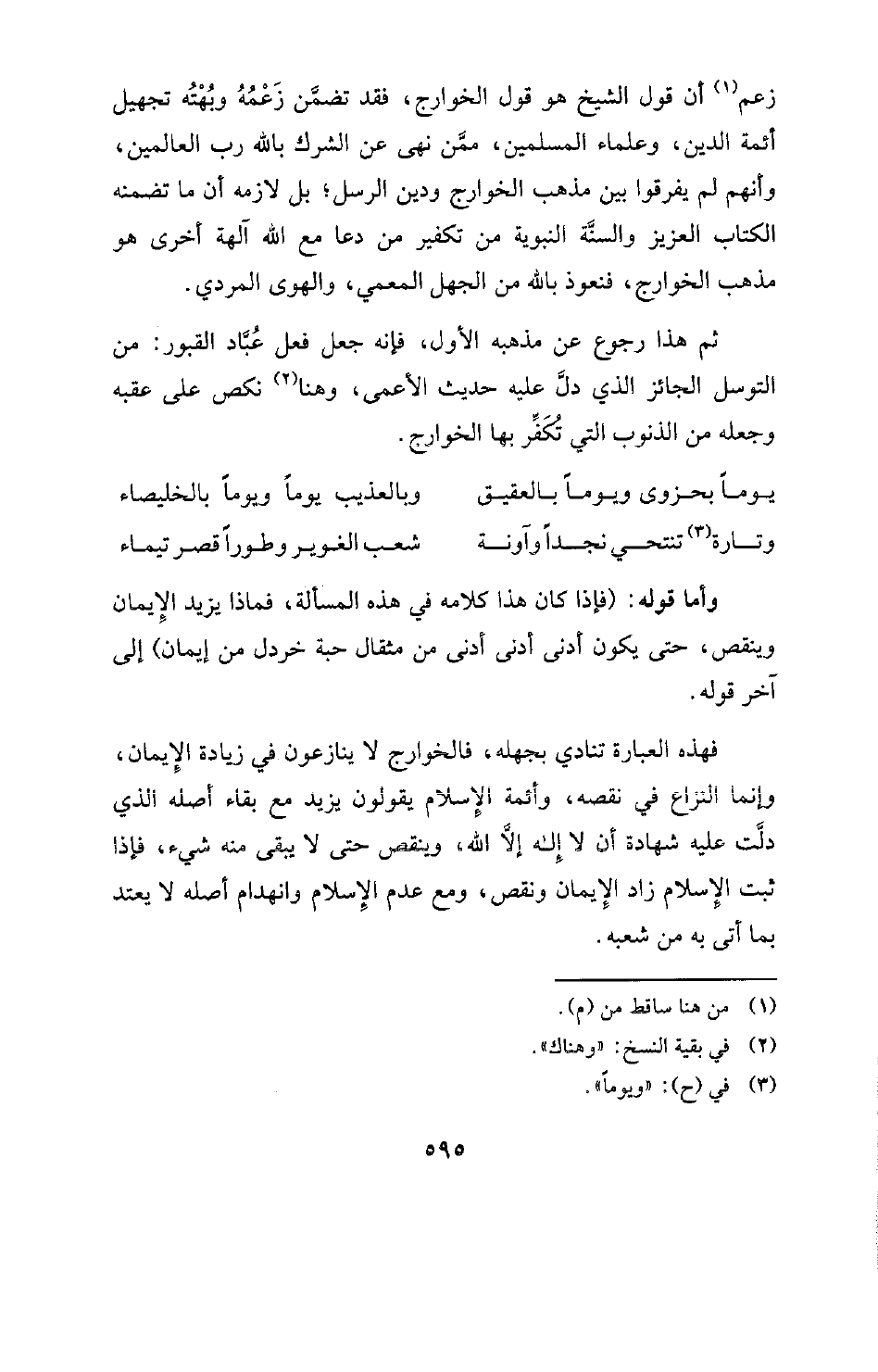 زعم (¬1) أن قول الشيخ هو قول الخوارج، فقد تضمَّن زَعْمُهُ وبُهْتُه تجهيل أئمة الدين، وعلماء المسلمين، ممَّن نهى عن الشرك بالله رب العالمين، وأنهم لم يفرقوا بين مذهب الخوارج ودين الرسل؛ بل لازمه أن ما تضمنه الكتاب العزيز والسنَّة النبوية من تكفير من دعا مع الله آلهة أخرى هو مذهب الخوارج، فنعوذ بالله من الجهل المعمي، والهوى المردي.