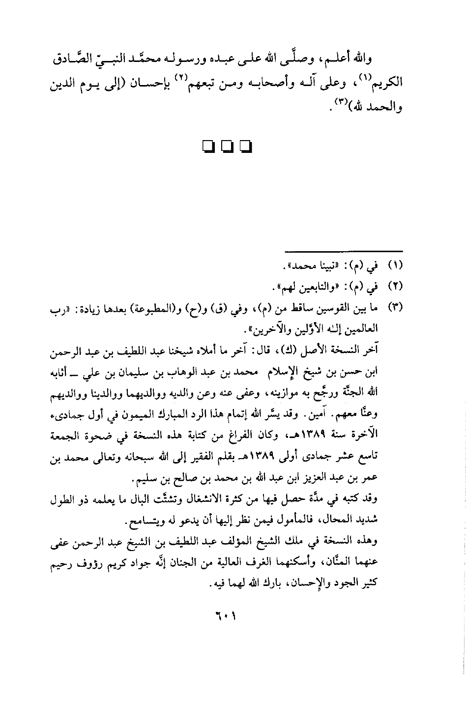 آخر النسخة الأصل (ك) ، قال: آخر ما أملاه شيخنا عبد اللطيف بن عبد الرحمن ابن حسن بن شيخ الإسلام محمد بن عبد الوهاب بن سليمان بن علي- أثابه اللَّه الجنة ورجح به موازينه، وعفى عنه وعن والديه ووالديهما ووالدينا ووالديهم وعنَّا معهم. آمين. وقد يسَّر اللَّه إتمام هذا الرد المبارك الميمون في أول جمادى الآخرة سنة 1389 هـ، وكان الفراغ من كتابة هذه النسخة في ضحوة الجمعة تاسع عشر جمادى أولى 1389 هـ بقلم الفقير إلى الله سبحانه وتعالى محمد بن عمر بن عبد العزيز ابن عبد الله بن محمد بن صالح بن سليم.
