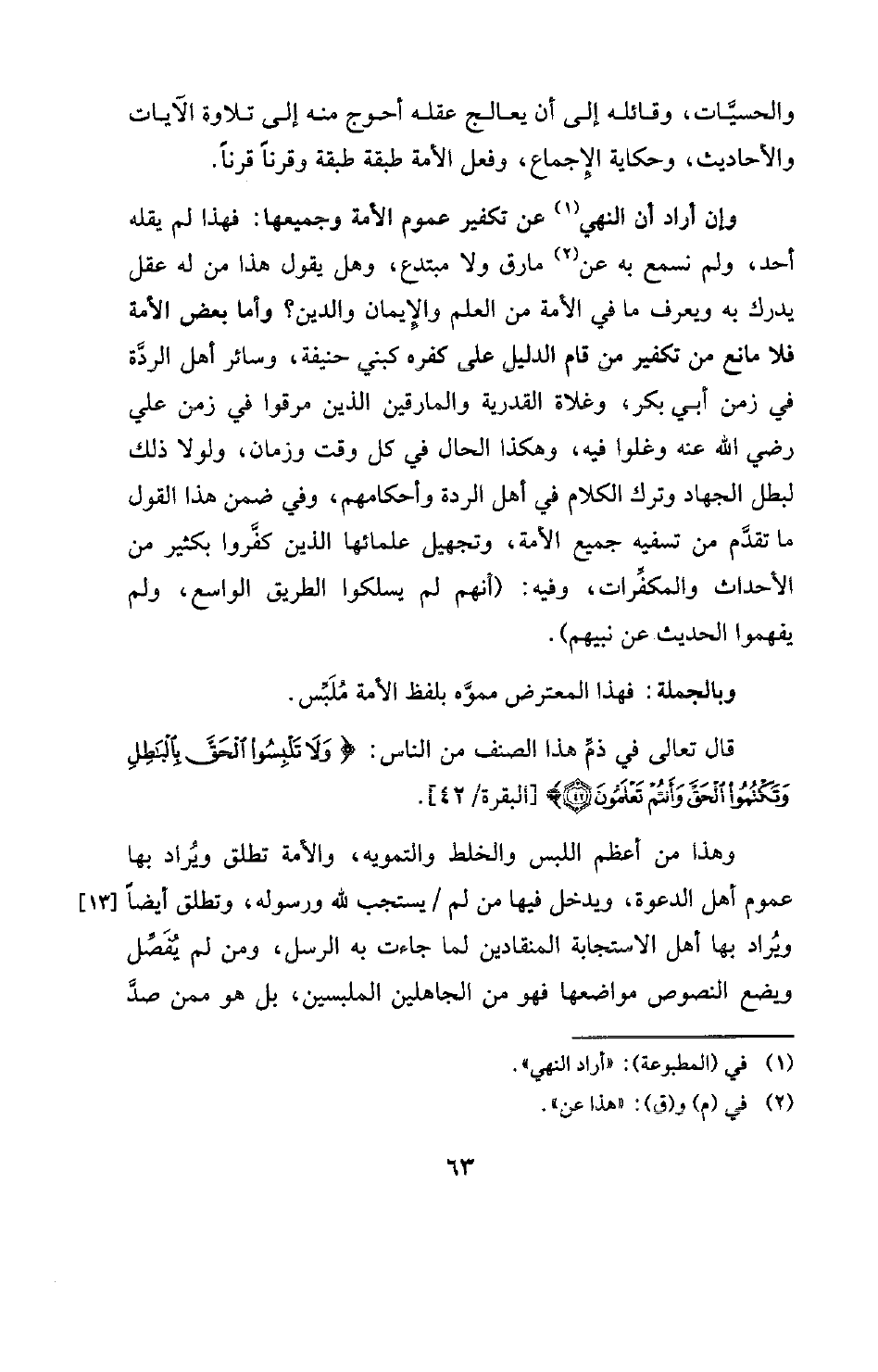 وهذا من أعظم اللبس والخلط والتمويه، والأمة تطلق ويُراد بها عموم أهل الدعوة، ويدخل فيها من لم يستجب لله ورسوله، وتطلق أيضًا [13] ، ويُراد بها أهل الاستجابة المنقادين لما جاءت به الرسل، ومن لم يُفَصّل ويضع النصوص مواضعها فهو من الجاهلين الملبسين، بل هو ممن صدَّ
