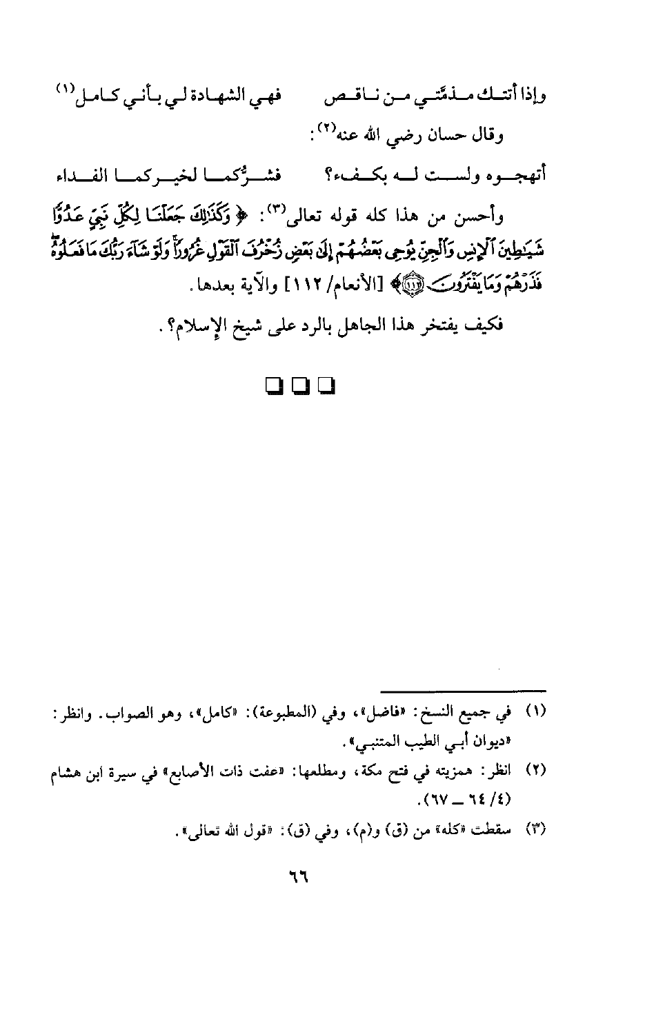 وأحسن من هذا كله قوله تعالى (¬3) {وَكَذَلِكَ جَعَلْنَا لِكُلِّ نَبِيٍّ عَدُوًّا شَيَاطِينَ الْإِنْسِ وَالْجِنِّ يُوحِي بَعْضُهُمْ إِلَى بَعْضٍ زُخْرُفَ الْقَوْلِ غُرُورًا وَلَوْ شَاءَ رَبُّكَ مَا فَعَلُوهُ فَذَرْهُمْ وَمَا يَفْتَرُونَ} [الأنعام: 112] [الأنعام -112] والآية بعدها.