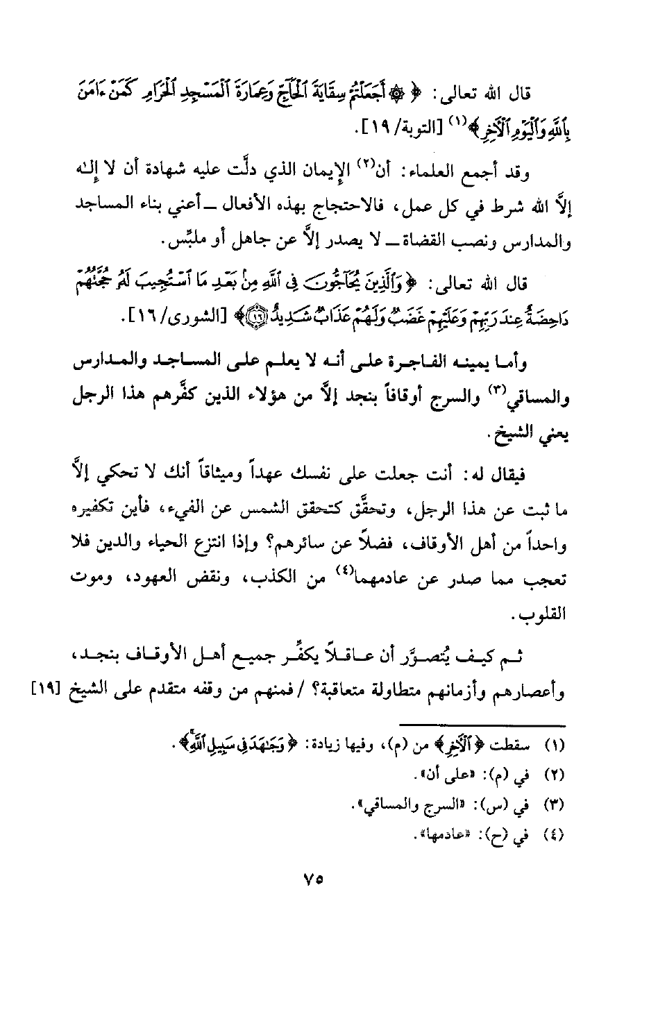 وأما يمينه الفاجرة على أنه لا يلم على المساجد والمدارس والمساقي (¬3) والسرج أوقافًا بنجد إلا من هؤلاء الذين كفرهم هذا الرجل يعني الشيخ.