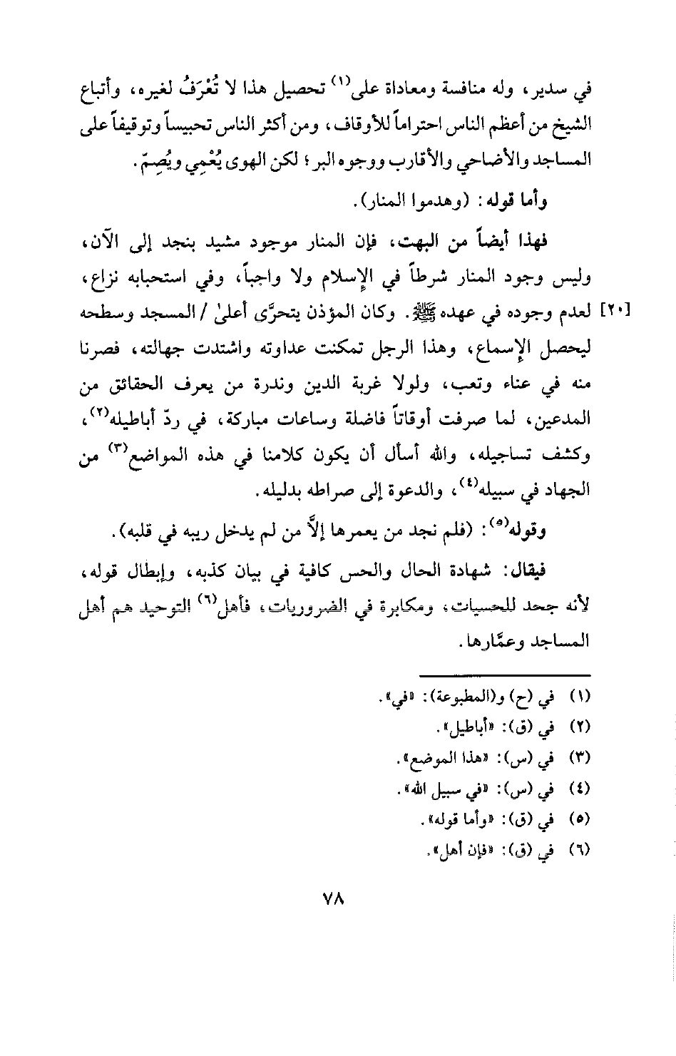 فهذا أيضًا من البهت، فإن المنار موجود مشيد بنجد إلى الآن، وليس وجود المنار شرطًا في الإسلام ولا واجبًا، وفي استحبابه نزاع، [20] لعدم وجوده في عهده صلى الله عليه وسلم. وكان المؤذن يتحرَّى أعلى المسجد وسطحه ليحصل الإسماع، وهذا الرجل تمكنت عداوته واشتدت جهالته، فصرنا منه في عناء وتعب، ولولا غربة الدين وندرة من يعرف الحقائق من المدعين، لما صرفت أوقاتًا فاضلة وساعات مباركة، في ردّ أباطيله (¬2) وكشف تساجيله، والله أسأل أن يكون كلامنا في هذه المواضع (¬3) من الجهاد في سبيله (¬4) والدعوة إلى صراطه بدليله.