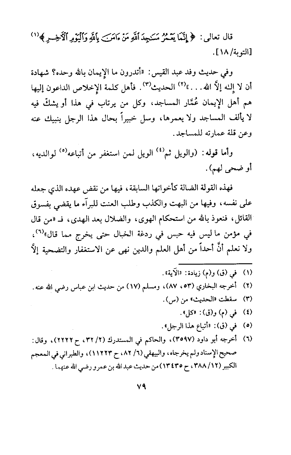 وفي حديث وفد عبد القيس: " «أتدرون ما الإيمان بالله وحده؟ شهادة أن لا إله إلا الله» . . . " (¬2) الحديث (¬3) فأهل كلمة الإخلاص الداعون إليها هم أهل الإيمان عُمَّار المساجد، وكل من يرتاب في هذا أو يشكّ فيه لا يألف المساجد ولا يعمرها، وسل خبيرًا بحال هذا الرجل ينبيك عنه وعن قلة عمارته للمساجد.