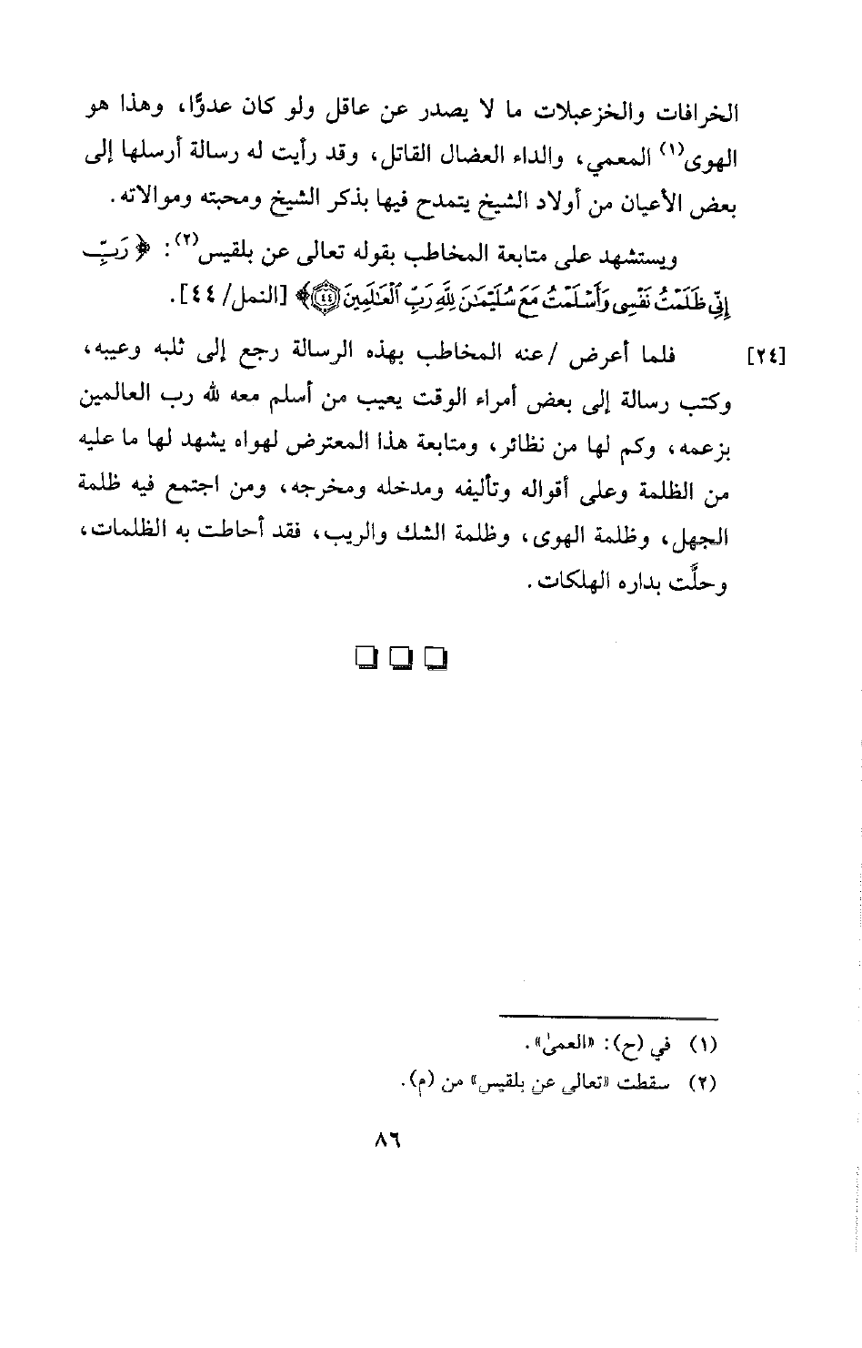 الخرافات والخزعبلات ما لا يصدر عن عاقل ولو كان عدوًّا، وهذا هو الهوى (¬1) المعمي، والداء العضال القاتل، وقد رأيت له رسالة أرسلها إلى بعض الأعيان من أولاد الشيخ يتمدح فيها بذكر الشيخ ومحبته وموالاته. ويستشهد على متابعة المخاطب بقوله تعالى عن بلقيس (¬2) {رَبِّ إِنِّي ظَلَمْتُ نَفْسِي وَأَسْلَمْتُ مَعَ سُلَيْمَانَ لِلَّهِ رَبِّ الْعَالَمِينَ} [النمل: 44] [النمل / 44] .