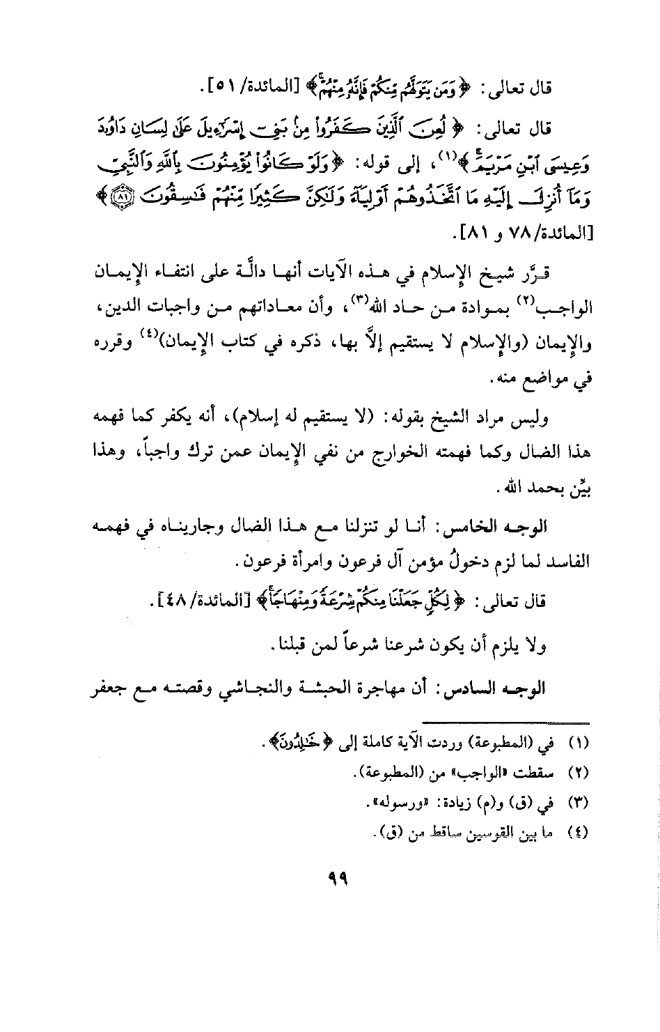قرَر شيخ الإسلام في هذه الآيات أنها دالَّة على انتفاء الإيمان الواجب (¬2) بموادة من حاد الله (¬3) وأن معاداتهم من واجبات الدين، والإيمان (والإسلام لا يستقيم إلا بها، ذكره في كتاب الإيمان) (¬4) وقرره في مواضع منه.