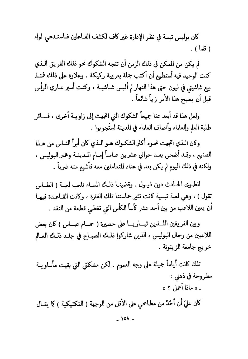 لم يكن من الممكن في ذلك الزمن أن تتجه الشكوك نحو ذلك الفريق الذي كنت الوحيد فيه أستطيع أن أكتب جملة بعربية ركيكة. وعلاوة على ذلك فمنذ بيع شاشيتي في ليون حتى هذا النهار لم ألبس شاشية، وكنت أسير عاري الرأس قبل أن يصبح هذا الأمر زياً شائعاً.