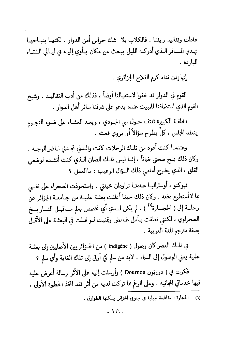 تمبوكتو، أوستراليا عادتا تراودان مخيلتي. واستحوذت الصحراء على نفسي بما لا أستطيع دفعه. وكان ذلك حينما أعلنت بعثة علمية من جامعة الجزائر عن رحلة إلى (الحجارة (¬1)). لم يكن لدي أي تخصص بعلم ما قبل التاريخ الصحراوي، لكنني تعلقت بأمل غامض وتمنيت لو قبلت في البعثة على الأقل بصفة مترجم للغة العربية.