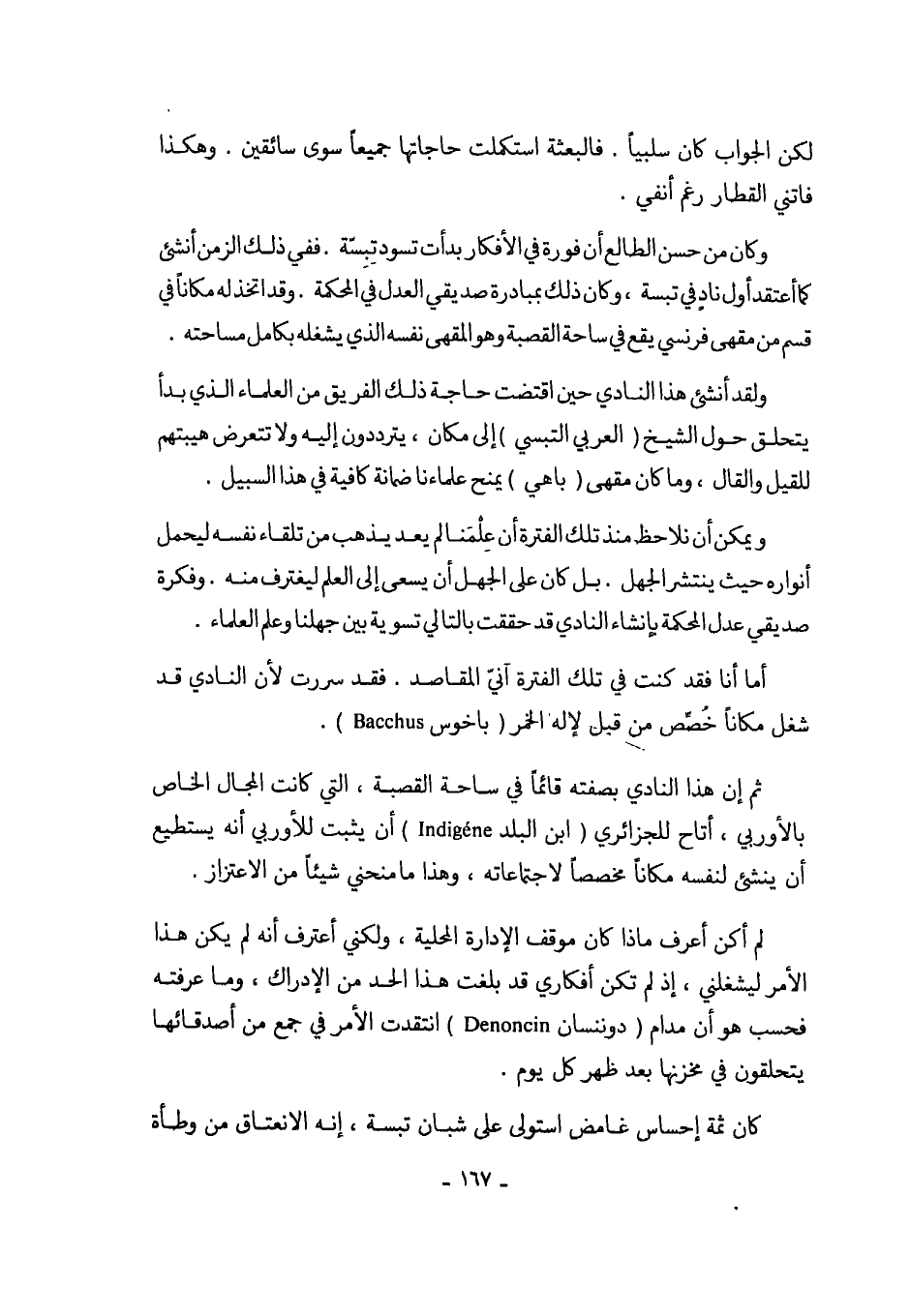 ثم إن هذا النادي بصفته قائماً في ساحة القصبة، التي كانت المجال الخاص بالأوربي، أتاح للجزائري (ابن البلد Indigène) أن يثبت للأوربي أنه يستطيع أن ينشئ لنفسه مكاناً مخصصاً لاجتماعاته، وهذا ما منحني شيئاً من الاعتزاز.