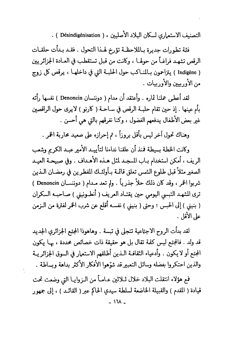 فثمة تطورات جديرة بالملاحظة تؤرخ لهذا التحول. فقد بدأت حلقات الرقص تشهد فراغاً من حولها، وكانت من قبل تستقطب في العادة الجزائريين ( Indigène) يتزاحمون بالمناكب حول الحلبة التي في داخلها، يرقص كل زوج من الأوربيين والأوربيات.