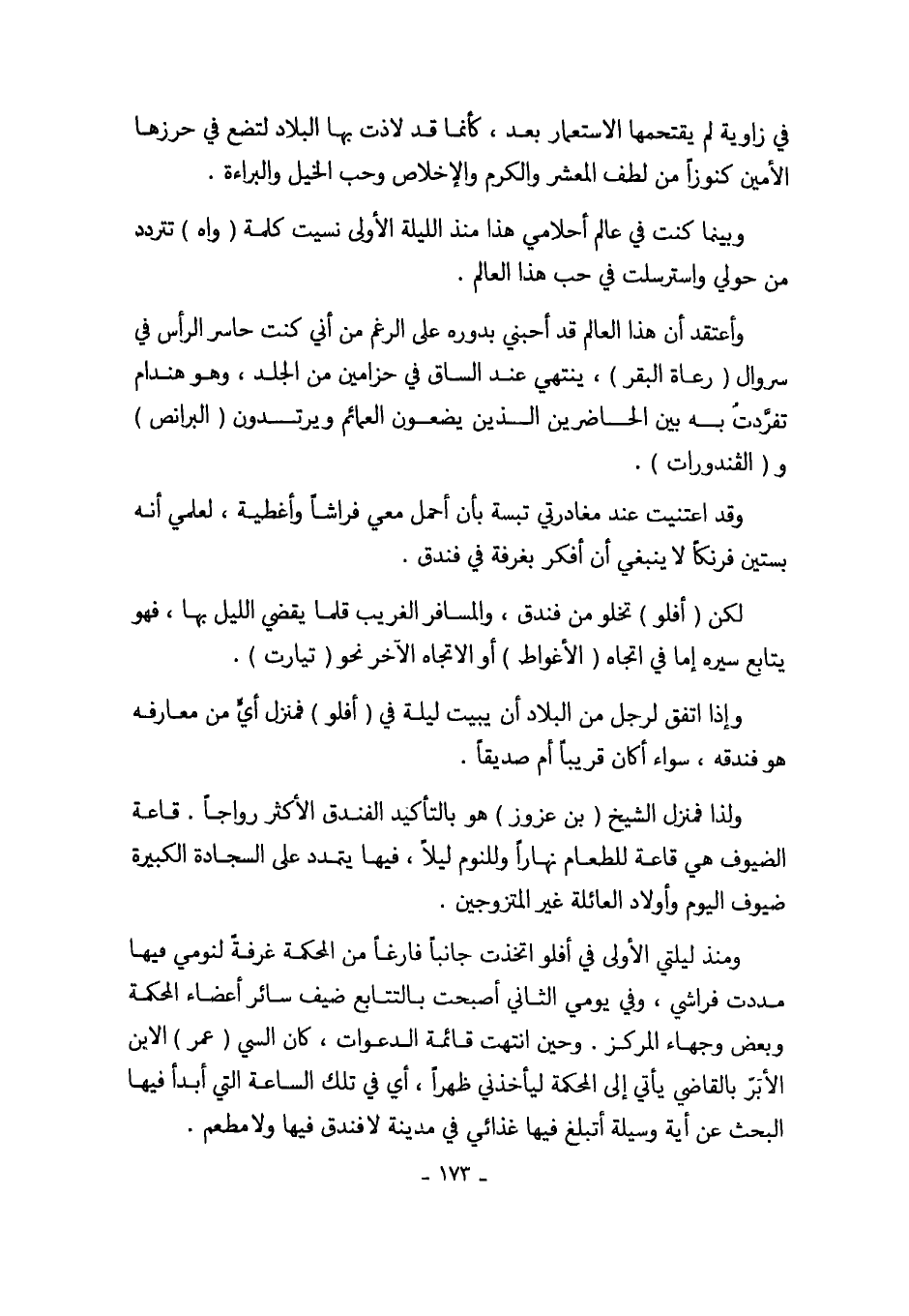 وإذا اتفق لرجل من البلاد أن يبيت ليلة في (أفلو) فمنزل أيٍّ من معارفه هو فندقه، سواء أكان قريباً أم صديقاً.
