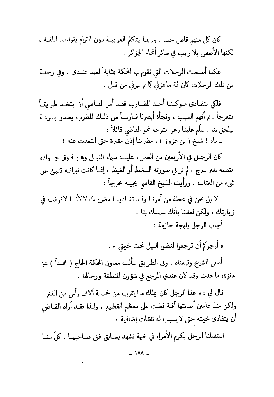 فلكي يتفادى موكبنا أحد المضارب فقد أمر القاضي أن يتخذ طريقاً متعرجاً. لم أفهم السبب، وفجأة أبصرنا فارساً من ذلك المضرب يعدو بسرعة ليلحق بنا. سلّم علينا وهو يتوجه نحو القاضي قائلاً: