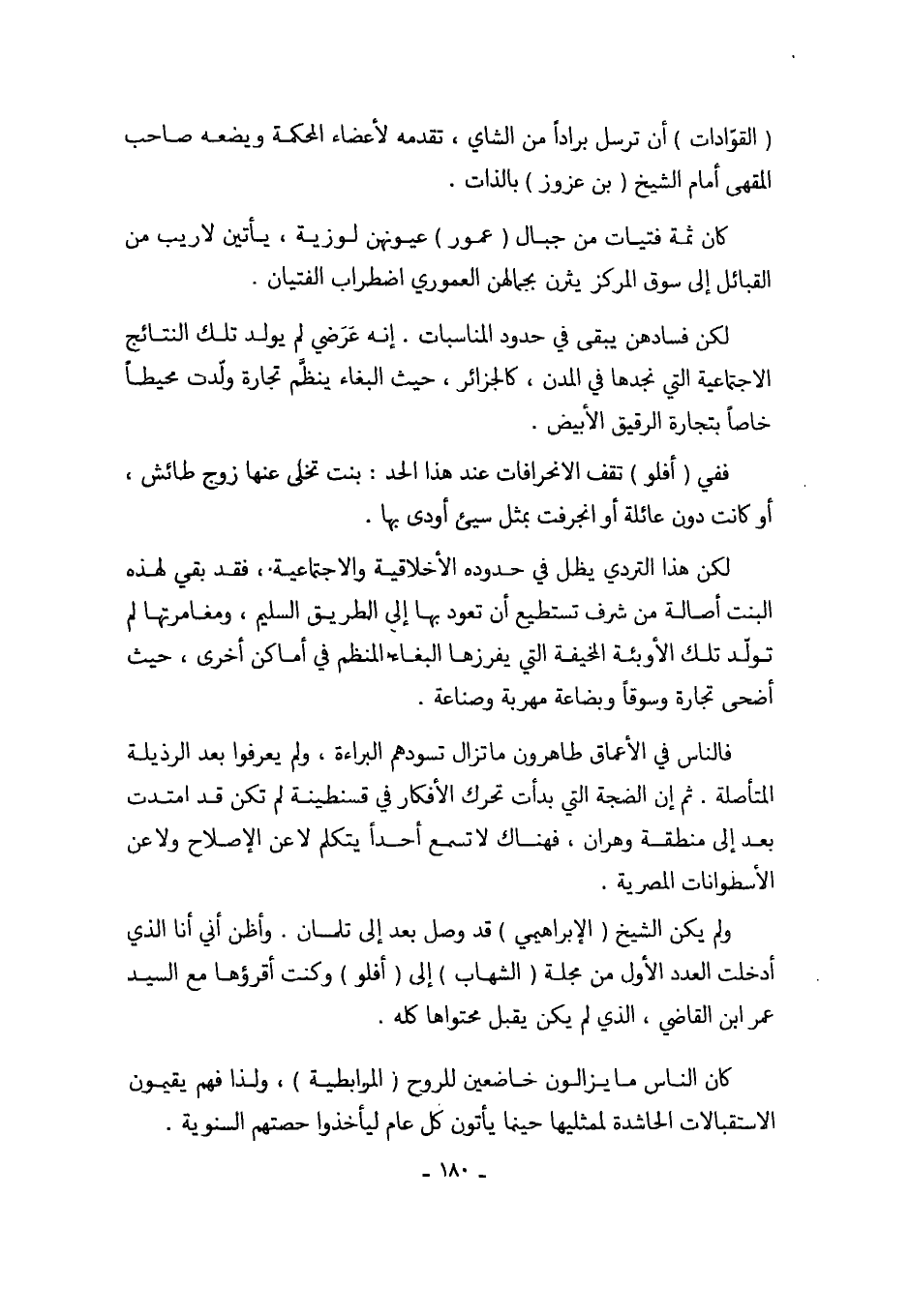 ولم يكن الشيخ (الإبراهيمي) قد وصل بعد إلى تلمسان. وأظن أني أنا الذي أدخلت العدد الأول من مجلة (الشهاب) إلى (أفلو) وكانت أقرؤها مع السيد عمر ابن القاضي، الذي لم يكن يقبل محتواها كله.