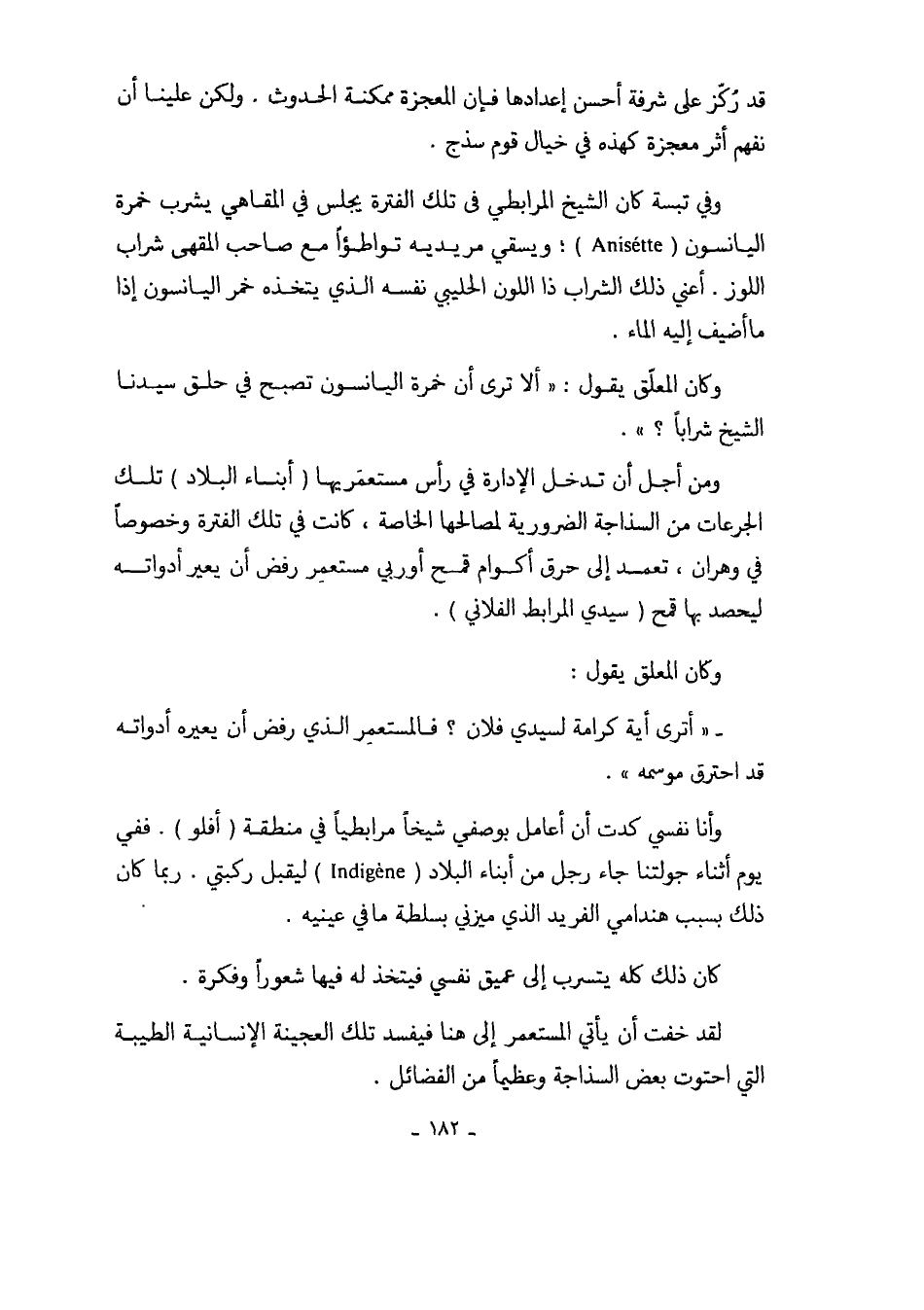 وفي تبسة كان الشيخ المرابطي فى تلك الفترة يجلس في المقاهي يشرب خمرة اليانسون ( Anisétte)؛ ويسقي مريديه تواطؤاً مع صاحب المقهى شراب اللوز. أعني ذلك الشراب ذا اللون الحليبي نفسه الذي يتخذه خمر اليانسون إذا ما أضيف إليه الماء.
