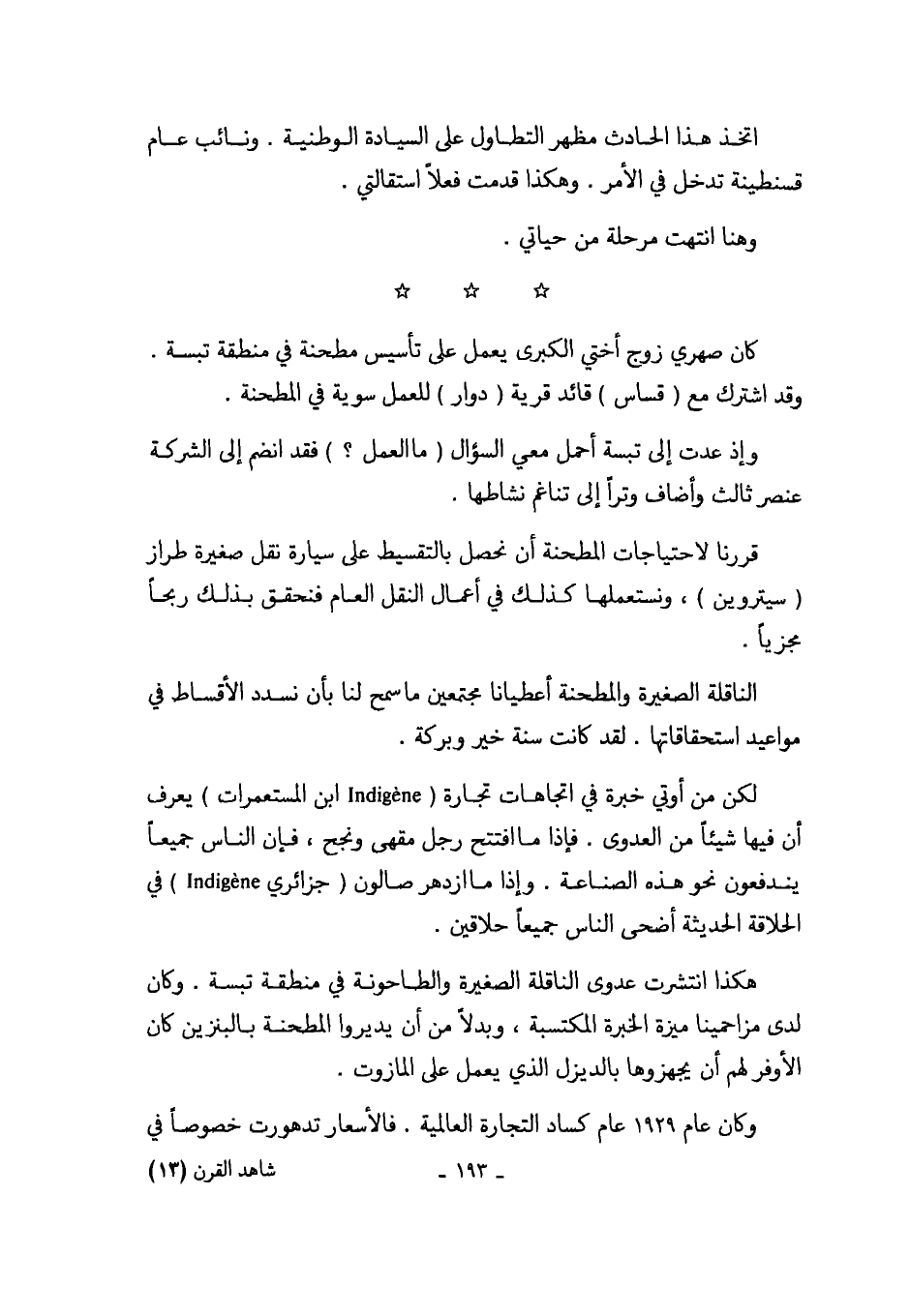 كان صهري زوج أختي الكبرى يعمل على تأسيس مطحنة في منطقة تبسة. وقد اشترك مع (قساس) قائدى قرية (دوار) للعمل سوية في المطحنة.