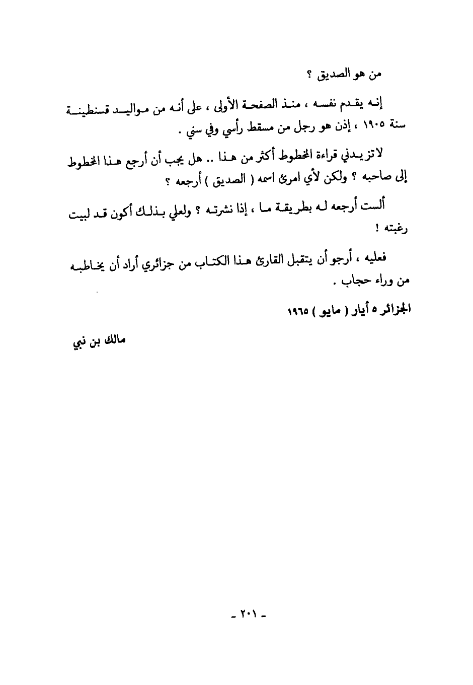 فعليه، أرجو أن يتقبل القارئ هذا الكتاب من جزائري أراد أن يخاطبه من وراء حجاب.