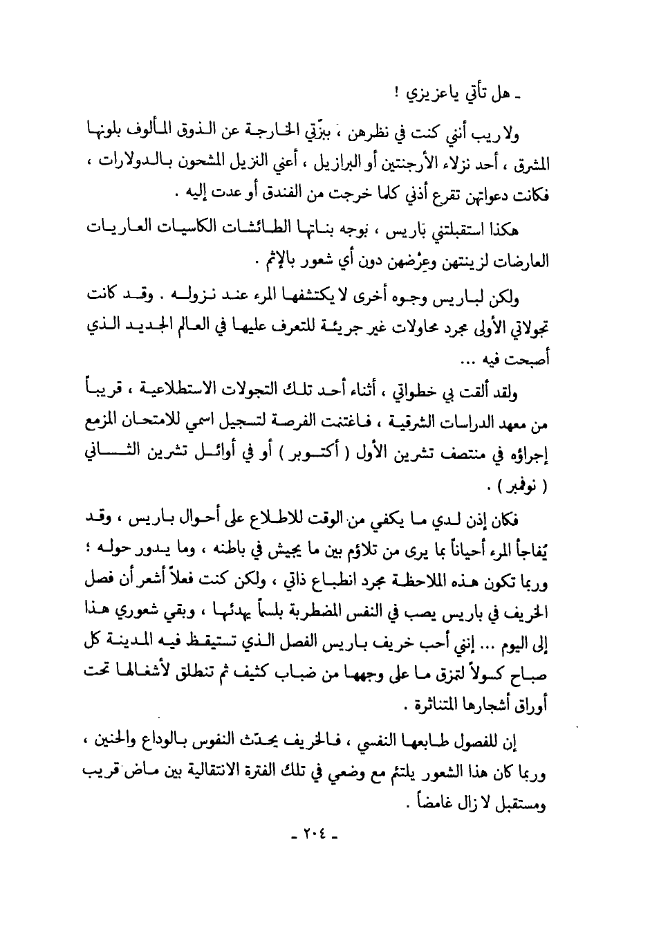 فكان إذن لدي ما يكفي من الوقت للاطلاع على أحوال باريس، وقد يُفاجأ المرء أحياناً بما يرى من تلاؤم بين ما يجيش في باطنه، وما يدور حوله؛ وربما تكون هذه الملاحظه مجرد انطباع ذاتي، ولكن كنت فعلاً أشعر أن فصل الخريف في باريس يصب في النفس المضطربة بلسماً يهدئها، وبقي شعوري هذا إلى اليوم ... إنني أحب خريف باريس الفصل الذي تستيقظ فيه المدينة كل صباح كسولاً لتمزق ما على وجهها من ضباب كثيف ثم تنطلق لأشغالها تحت أوراق أشجارها المتناثرة.