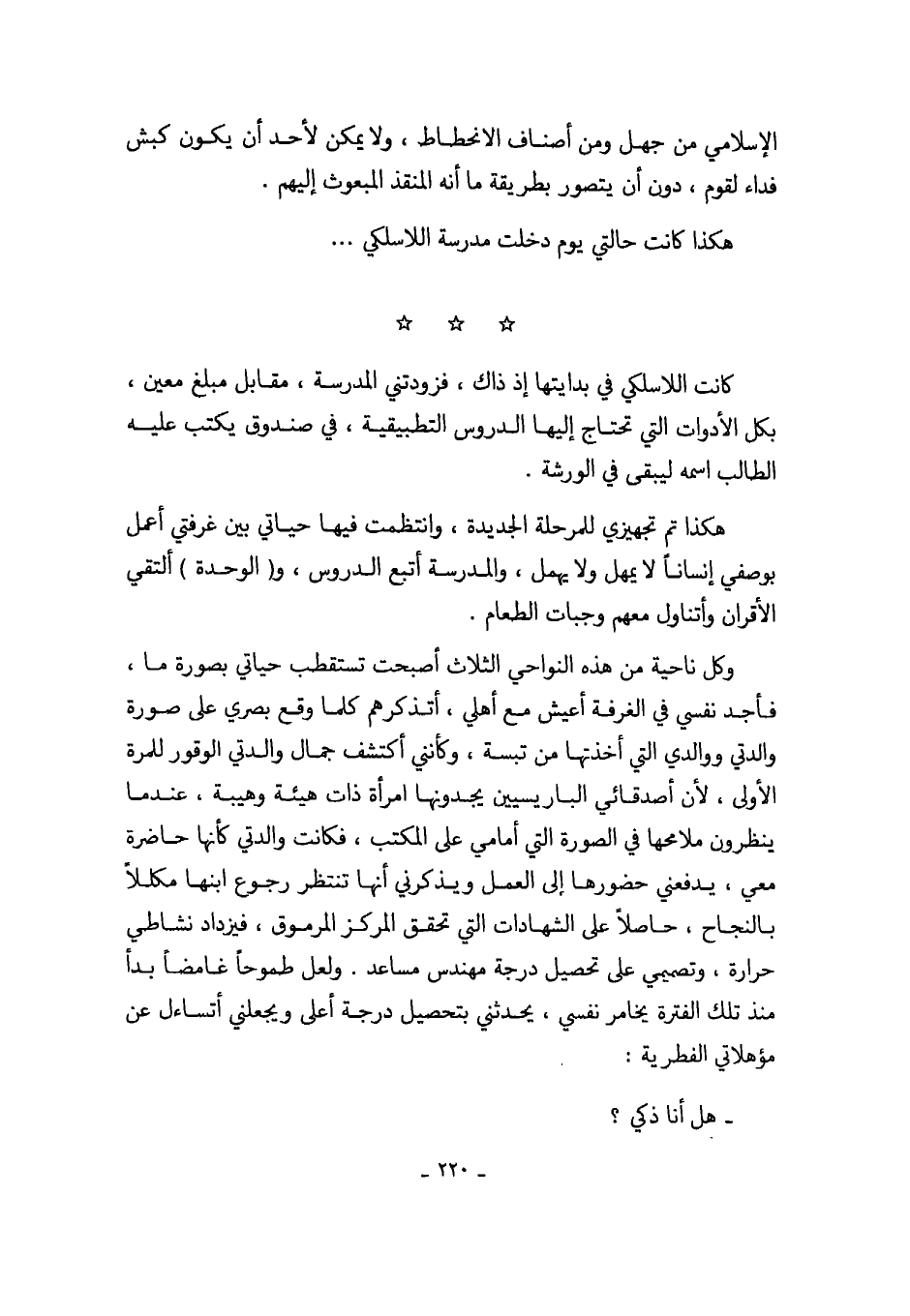 هكذا تم تجهيزي للمرحلة الجديدة، وانتظمت فيها حياتي بين غرفتي أعمل بوصفي إنساناً لا يمهل ولا يهمل، والمدرسة أتبع الدروس، و (الوحدة) ألتقي الأقران وأتناول معهم وجبات الطعام.