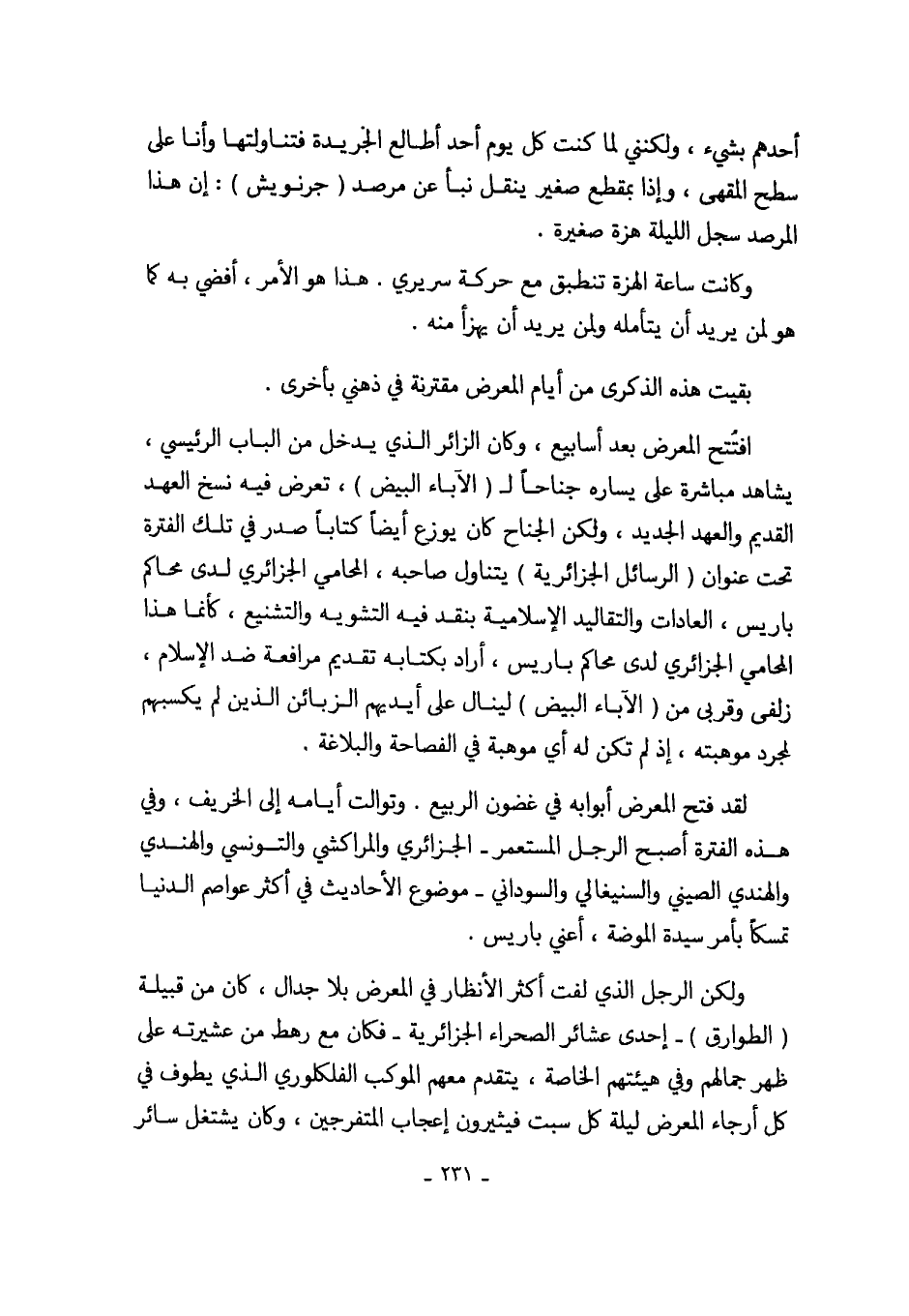 افتُتح المعرض بعد أسابيع، وكان الزائر الذي يدخل من الباب الرئيسي، يشاهد مباشرة على يساره جناحاً لـ (الآباء البيض)، تعرض فيه نسخ العهد القديم والعهد الجديد، ولكن الجناح كان يوزع أيضاً كتاباً صدر في تلك الفترة تحت عنوان (الرسائل الجزائرية) يتناول صاحبه، المحامي الجزائري لدى محاكم باريس، العادات والتقاليد الإسلامية بنقد فيه التشويه والتشنيع، كأنما هذا المحامي الجزائري لدى محاكم باريس، أراد بكتابه تقديم مرافعة ضد الإسلام، زلفى وقربى من (الآباء البيض) لينال على أيديهم الزبائن الذين لم يكسبهم لمجرد موهبته، إذ لم تكن له أي موهبة في الفصاحة والبلاغة.