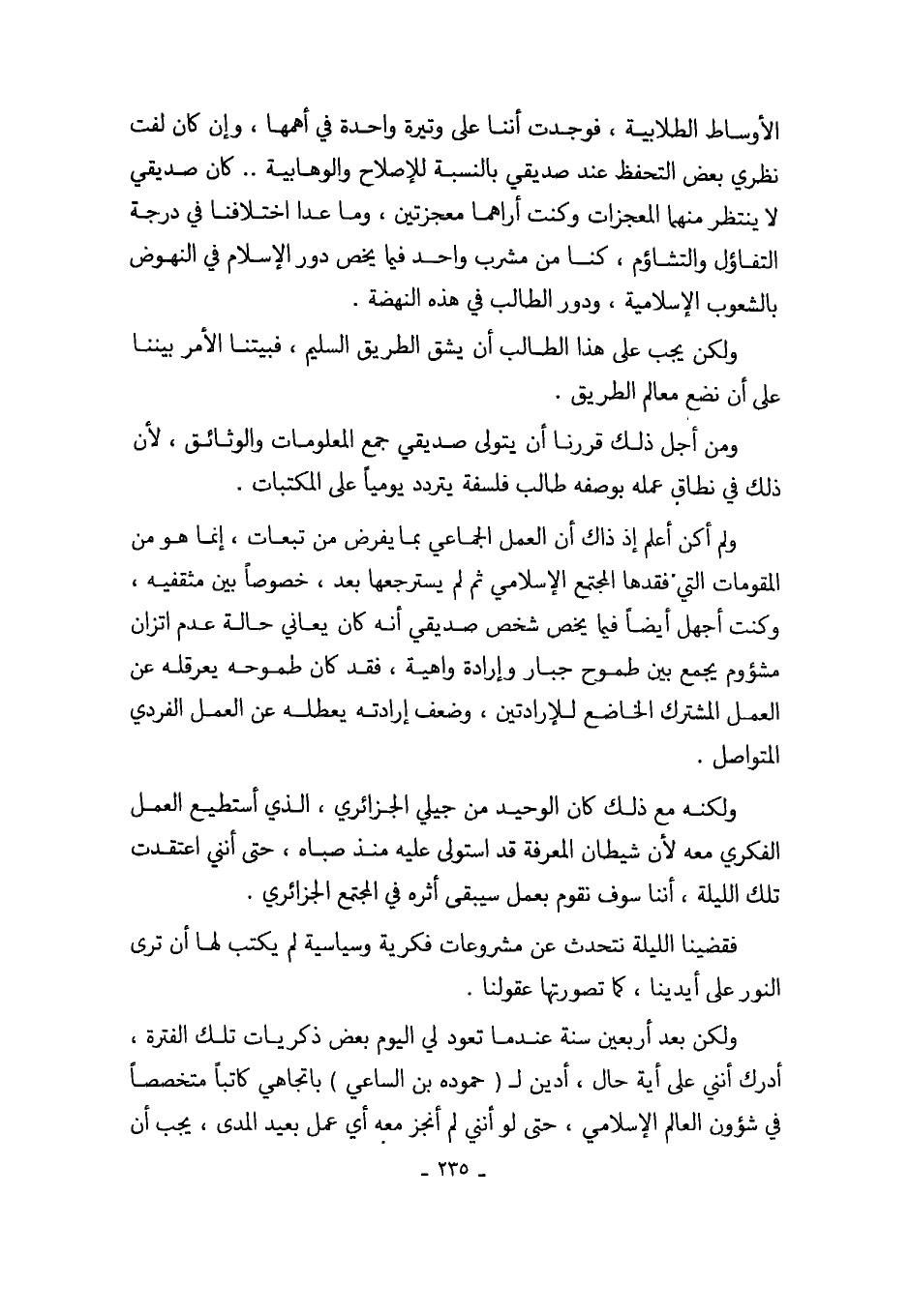 ولم أكن أعلم إذ ذاك أن العمل الجماعي بما يفرض من تبعات، إنما هو من المقومات التي فقدها المجتمع الإسلامي ثم لم يسترجعها بعد، خصوصاً بين مثقفيه، وكنت أجهل أيضاً فيما يخص شخص صديقي أنه كان يعاني حالة عدم اتزان مشؤوم يجمع بين طموح جبار وإرادة واهية، فقد كان طموحه يعرقله عن العمل المشترك الخاضع للإرادتين، وضعف إرادته يعطله عن العمل الفردي المتواصل.