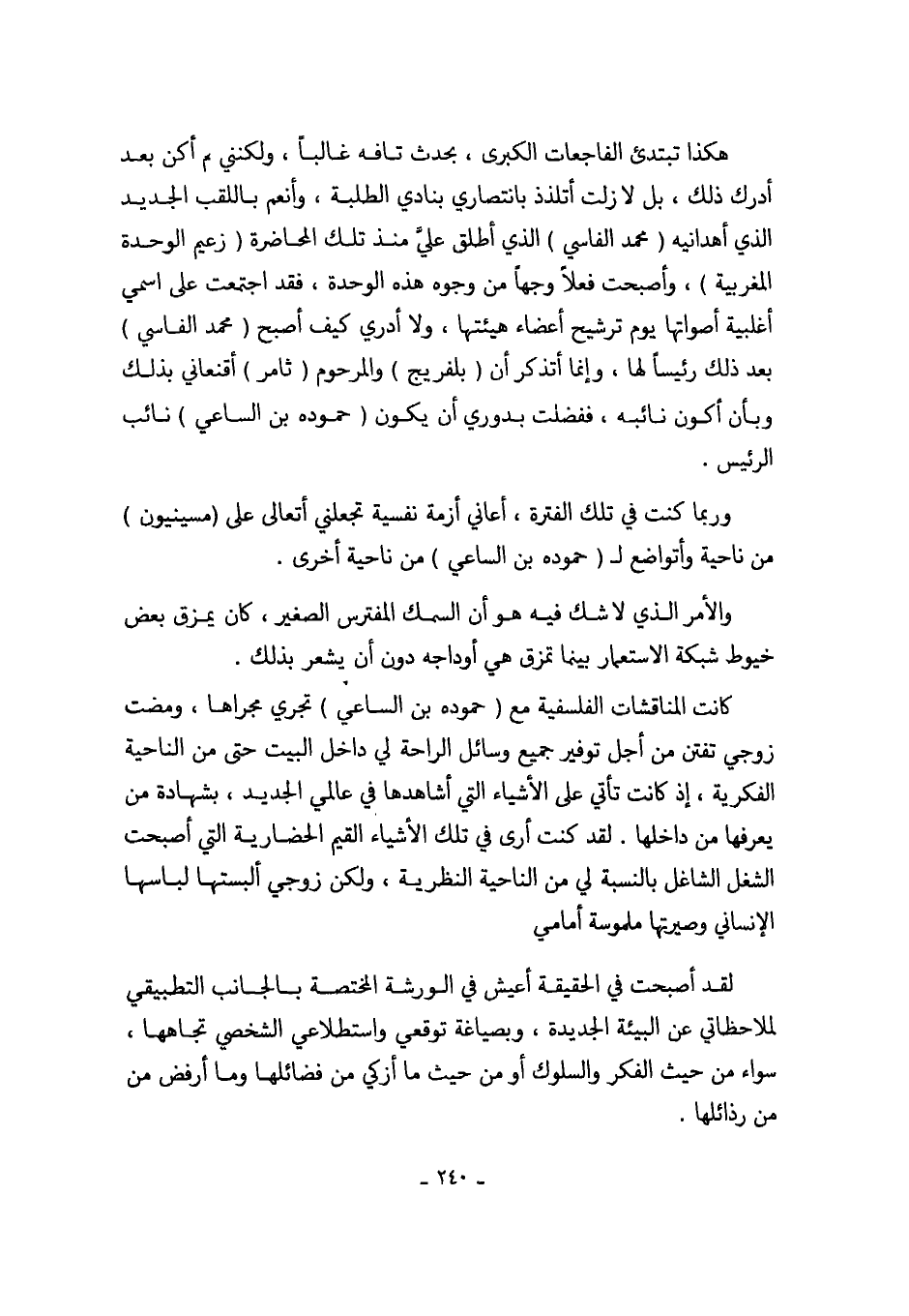 كانت المناقشات الفلسفية مع (حموده بن الساعي) تجري مجراها، ومضت زوجي تفتن من أجل توفير جميع وسائل الراحة لي داخل البيت حتى من الناحية الفكرية، إذ كانت تأتي على الأشياء التي أشاهدها في عالمي الجديد، بشهادة من يعرفها من داخلها. لقد كنت أرى في تلك الأشياء القيم الحضارية التي أصبحت الشغل الشاغل بالنسبة لي من الناحية النظرية، ولكن زوجي ألبستها لباسها الإنساني وصيرتها ملموسة أمامي.