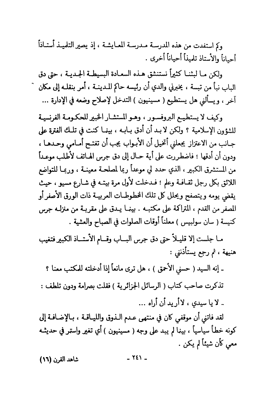 لقد فاتني أن موقفي كان في منتهى عدم الذوق واللياقة، بالإضافة إلى كونه خطأ سياسياً، بينما لم يبد على وجه (مسينيون) أي تغير واستمر في حديثه معي كأن شيئاً لم يكن.